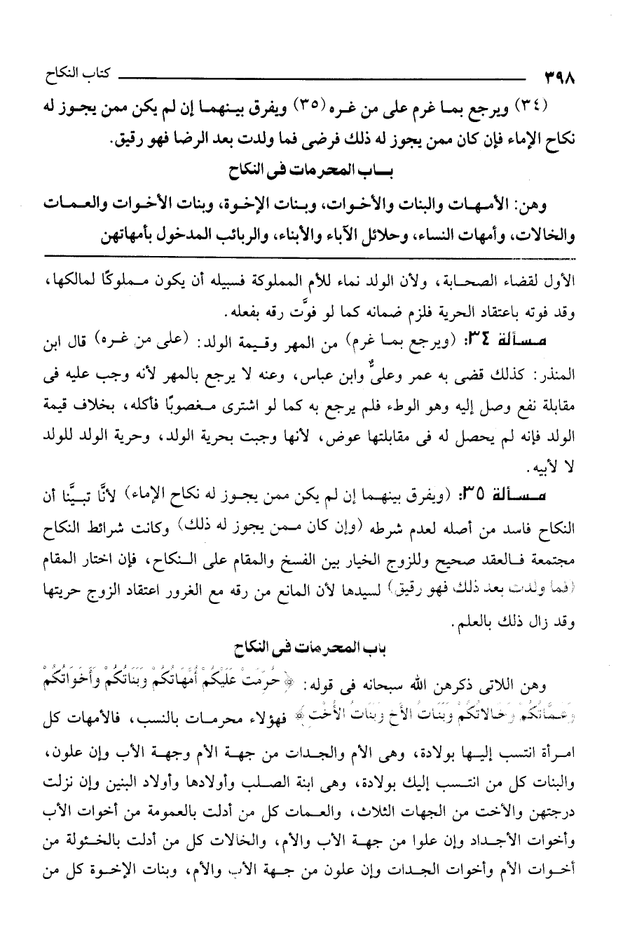 باب المحرمات في النكاح وهن اللاتي ذكرهن الله سبحانه في قوله: {حُرِّمَتْ عَلَيْكُمْ أُمَّهَاتُكُمْ وَبَنَاتُكُمْ وَأَخَوَاتُكُمْ وَعَمَّاتُكُمْ وَخَالاتُكُمْ وَبَنَاتُ الأَخِ وَبَنَاتُ الأُخْتِ} [النساء: 23] فهؤلاء محرمات بالنسب، فالأمهات كل امرأة انتسب إليها بولادة، وهي الأم والجدات من جهة الأم وجهة الأب وإن علون، والبنات كل من انتسب إليك بولادة، وهي ابنة الصلب وأولادها وأولاد البنين وإن نزلت درجتهن، والأخت من الجهات الثلاث، والعمات كل من أدلت بالعمومة من أخوات الأب وأخوات الأجداد وإن علوا من جهة الأب والأم، والخالات كل من أدلت بالخئولة من أخوات الأم وأخوات الجدات وإن علون من جهة الأب والأم، وبنات الإخوة كل من