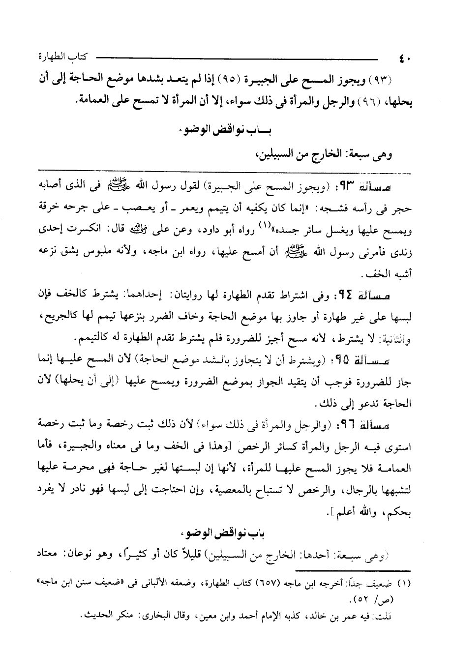 ـــــــــــــــــــــــــــــQمسألة 93: (ويجوز المسح على الجبيرة) «لقول رسول الله - صَلَّى اللَّهُ عَلَيْهِ وَسَلَّمَ - في الذي أصابه حجر في رأسه فشجه: "إنما كان يكفيه أن يتيمم ويعمر - أو يعصب - على جرحه خرقة ويمسح عليها ويغسل سائر جسده» رواه أبو داود، وعن علي - رَضِيَ اللَّهُ عَنْهُ - قال: «انكسرت إحدى زندي فأمرني رسول الله - صَلَّى اللَّهُ عَلَيْهِ وَسَلَّمَ - أن أمسح عليها» ، رواه ابن ماجه، ولأنه ملبوس يشق نزعه أشبه الخف.