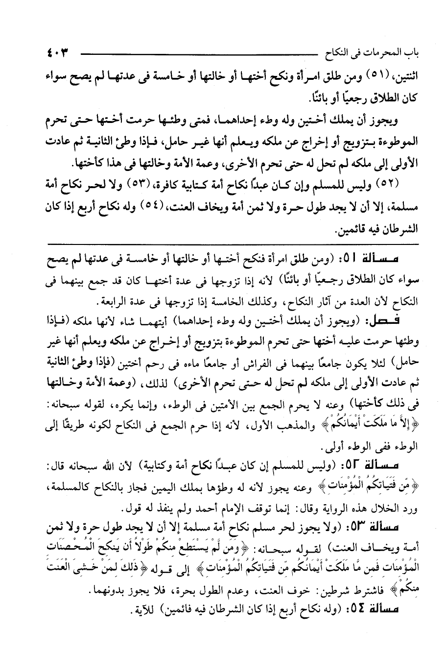 مسألة 52: (وليس للمسلم إن كان عبدًا نكاح أمة وكتابية) لأن الله سبحانه قال: {مِنْ فَتَيَاتِكُمُ الْمُؤْمِنَاتِ} [النساء: 25] وعنه يجوز لأنه له وطؤها بملك اليمين فجاز بالنكاح كالمسلمة، ورد الخلال هذه الرواية وقال: إنما توقف الإمام أحمد ولم ينفذ له قول.