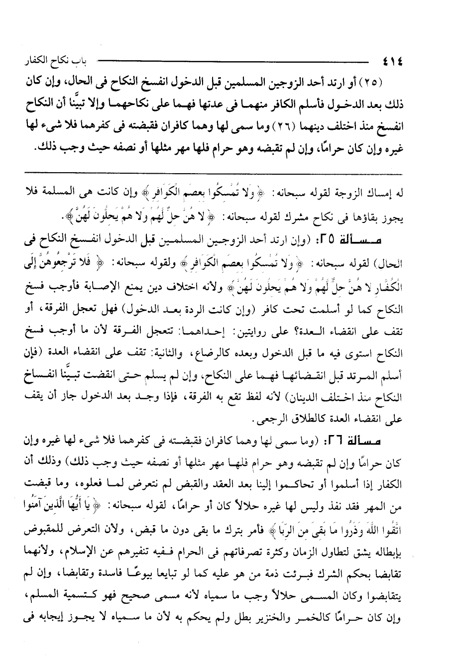 مسألة 25: (وإن ارتد أحد الزوجين المسلمين قبل الدخول انفسخ النكاح في الحال) لقوله سبحانه: {وَلا تُمْسِكُوا بِعِصَمِ الْكَوَافِرِ} [الممتحنة: 10] ولقوله سبحانه: {فَلا تَرْجِعُوهُنَّ إِلَى الْكُفَّارِ لا هُنَّ حِلٌّ لَهُمْ وَلا هُمْ يَحِلُّونَ لَهُنَّ} [الممتحنة: 10] ، ولأنه اختلاف دين يمنع الإصابة فأوجب فسخ النكاح كما لو أسلمت تحت كافر (وإن كانت الردة بعد الدخول) فهل تعجل الفرقة، أو تقف على انقضاء العدة؟ على روايتين: إحداهما: تتعجل الفرقة لأن ما أوجب فسخ النكاح استوى فيه ما قبل الدخول وبعده كالرضاع، والثانية: تقف على انقضاء العدة (فإن أسلم المرتد قبل انقضائها فهما على النكاح، وإن لم يسلم حتى انقضت تبينا انفساخ النكاح منذ اختلف الدينان) لأنه لفظ تقع به الفرقة، فإذا وجد بعد الدخول جاز أن يقف على انقضاء العدة كالطلاق الرجعي.