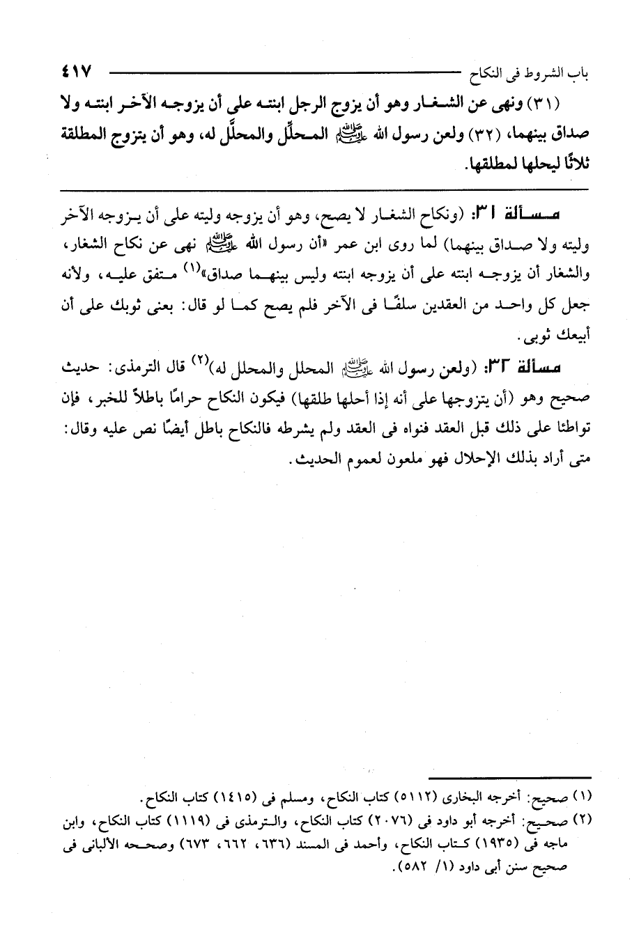 (32) «ولعن رسول الله - صَلَّى اللَّهُ عَلَيْهِ وَسَلَّمَ - المحلل والمحلل له» ، وهو أن يتزوج المطلقة ثلاثا ليحلها لمطلقها
