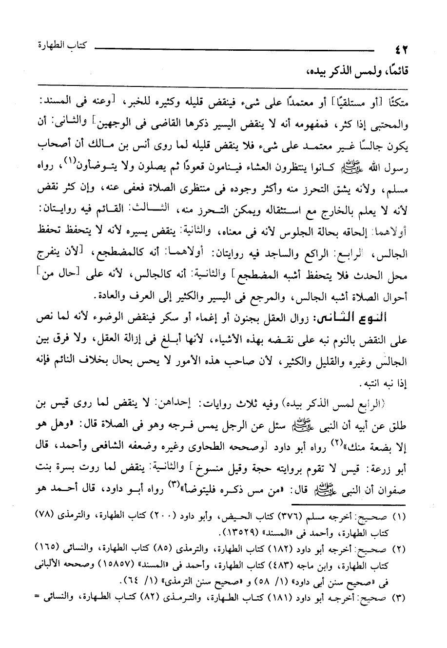 (الرابع لمس الذكر بيده) وفيه ثلاث روايات: إحداهن: لا ينقض لما روى قيس بن طلق عن أبيه «أن النبي - صَلَّى اللَّهُ عَلَيْهِ وَسَلَّمَ - سئل عن الرجل يمس فرجه وهو في الصلاة قال: " وهل هو إلا بضعة منك» رواه أبو داود [وصححه الطحاوي وغيره وضعفه الشافعي وأحمد، قال أبو زرعة: قيس لا تقوم بروايته حجة، وقيل منسوخ] ، والثانية: ينقض لما روت بسرة بنت صفوان أن النبي - صَلَّى اللَّهُ عَلَيْهِ وَسَلَّمَ - قال: «من مس ذكره فليتوضأ» رواه أبو داود، قال أحمد هو