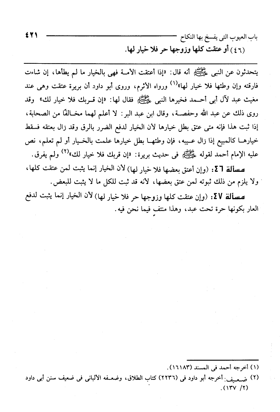 (46) أو عتقت كلها وزوجها حر فلا خيار لها