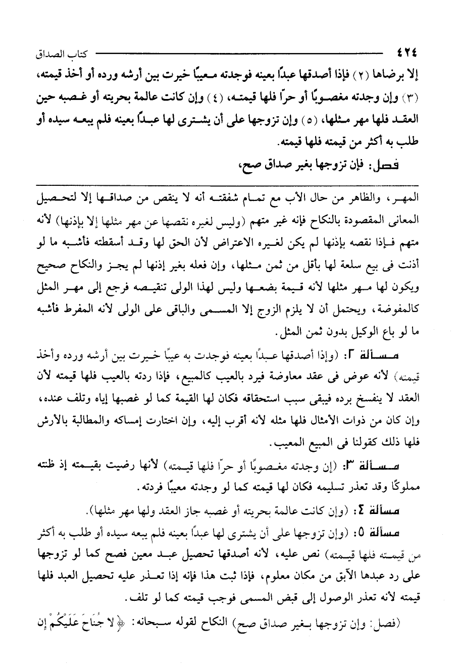 مسألة 5: (وإن تزوجها على أن يشتري لها عبدًا بعينه فلم يبعه سيده أو طلب به أكثر من قيمته فلها قيمته) نص عليه، لأنه أصدقها تحصيل عبد معين فصح كما لو تزوجها على رد عبدها الآبق من مكان معلوم، فإذا ثبت هذا فإنه إذا تعذر عليه تحصيل العبد فلها قيمته لأنه تعذر الوصول إلى قبض المسمى فوجب قيمته كما لو تلف.