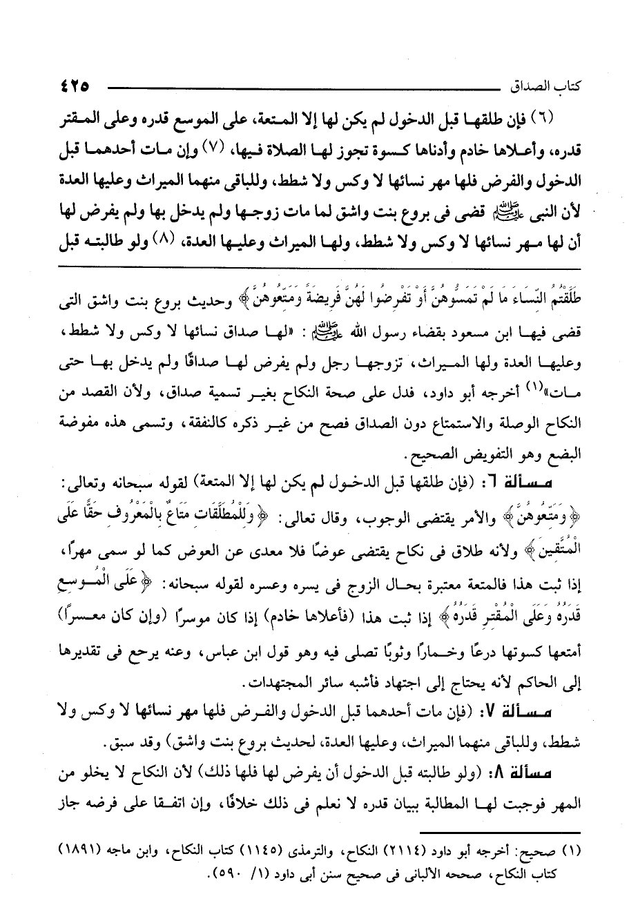 (6) فإن طلقها قبل الدخول لم يكن لها إلا المتعة، على الموسع قدره وعلى المقتر قدره، وأعلاها خادم وأدناها كسوة تجوز لها الصلاة فيها