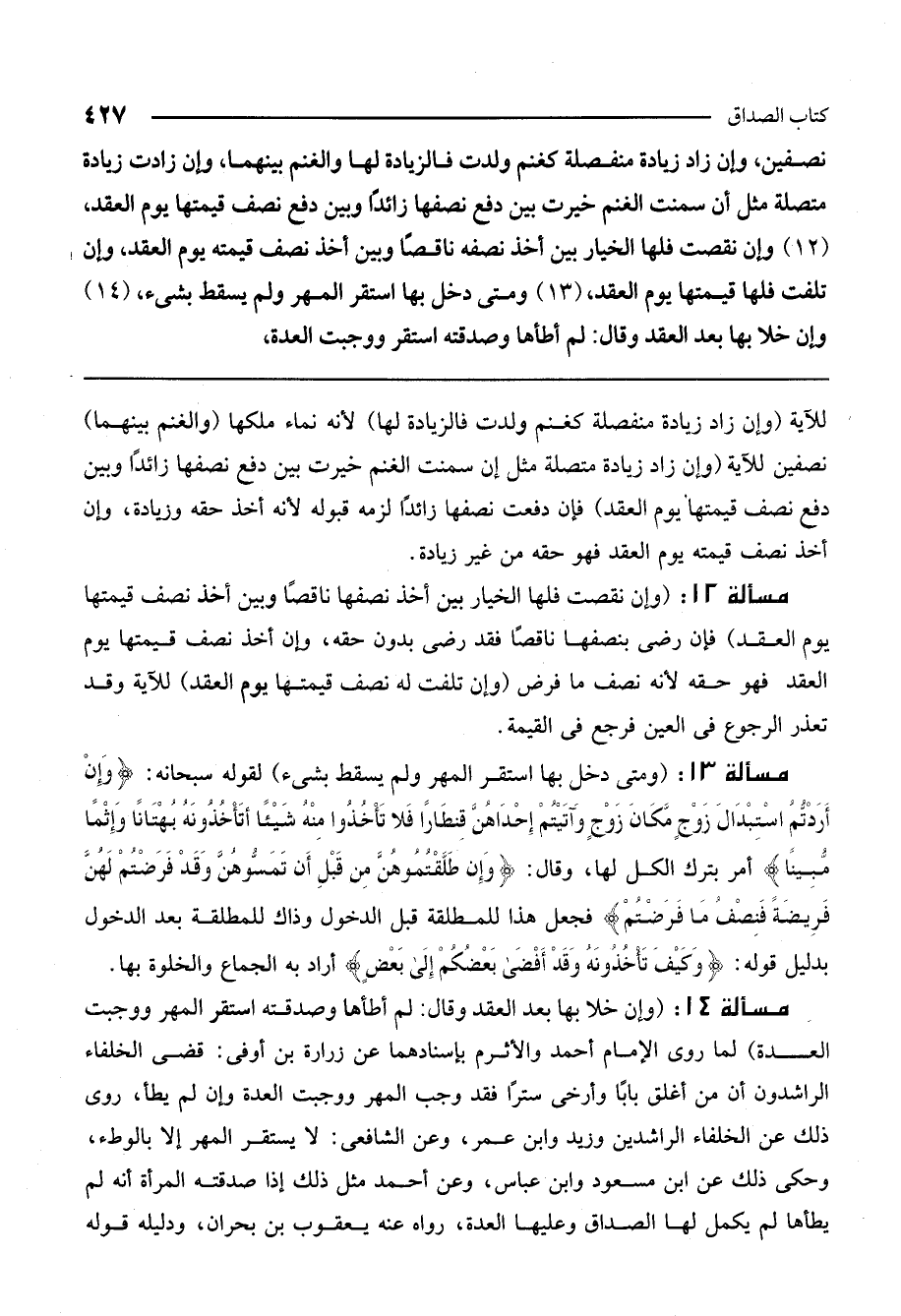 مسألة 13: (ومتى دخل بها استقر المهر ولم يسقط بشيء) لقوله سبحانه: {وَإِنْ أَرَدْتُمُ اسْتِبْدَالَ زَوْجٍ مَكَانَ زَوْجٍ وَآتَيْتُمْ إِحْدَاهُنَّ قِنْطَارًا فَلا تَأْخُذُوا مِنْهُ شَيْئًا أَتَأْخُذُونَهُ بُهْتَانًا وَإِثْمًا مُبِينًا} [النساء: 20] أمر بترك الكل لها، وقال: {وَإِنْ طَلَّقْتُمُوهُنَّ مِنْ قَبْلِ أَنْ تَمَسُّوهُنَّ وَقَدْ فَرَضْتُمْ لَهُنَّ فَرِيضَةً فَنِصْفُ مَا فَرَضْتُمْ} [البقرة: 237] فجعل هذا للمطلقة قبل الدخول وذاك للمطلقة بعد الدخول بدليل قوله: {وَكَيْفَ تَأْخُذُونَهُ وَقَدْ أَفْضَى بَعْضُكُمْ إِلَى بَعْضٍ} [النساء: 21] أراد به الجماع والخلوة بها.