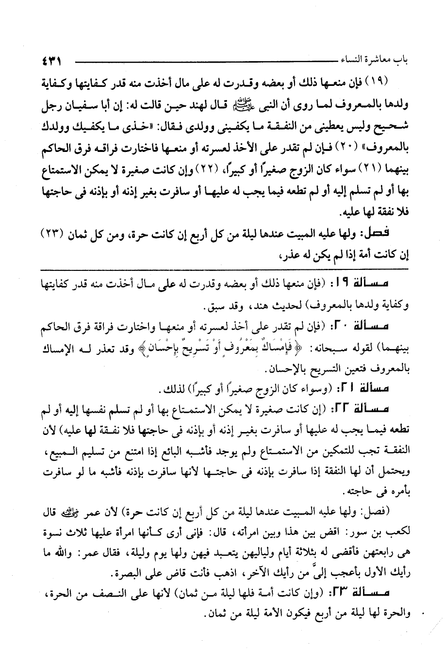 ـــــــــــــــــــــــــــــQمسألة 19: (فإن منعها ذلك أو بعضه وقدرت له على مال أخذت منه قدر كفايتها وكفاية ولدها بالمعروف) لحديث هند، وقد سبق.