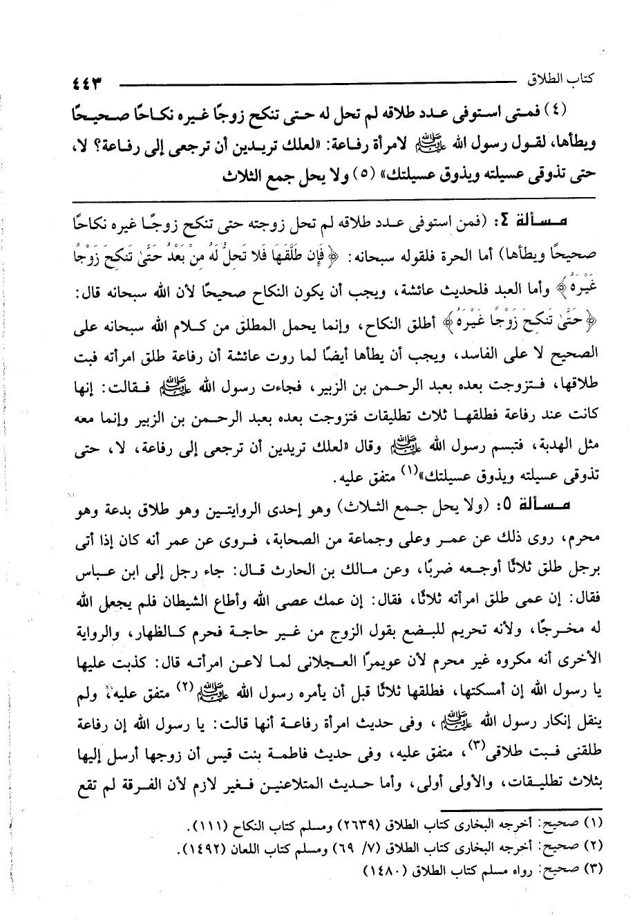 (4) فمتى استوفى عدد طلاقه لم تحل له حتى تنكح زوجا غيره نكاحا صحيحا ويطأها، «لقول رسول الله - صَلَّى اللَّهُ عَلَيْهِ وَسَلَّمَ - لامرأة رفاعة: " لعلك تريدين أن ترجعي إلى رفاعة؟ لا، حتى تذوقي عسيلته ويذوق عسيلتك»