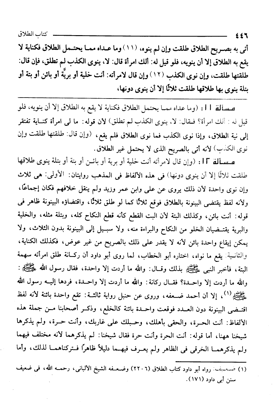 (11) وما عداه مما يحتمل الطلاق فكناية لا يقع به الطلاق إلا أن ينويه، فلو قيل له: ألك امرأة؟ قال: لا، ينوي الكذب لم تطلق، فإن قال: طلقتها، طلقت، وإن نوى الكذب