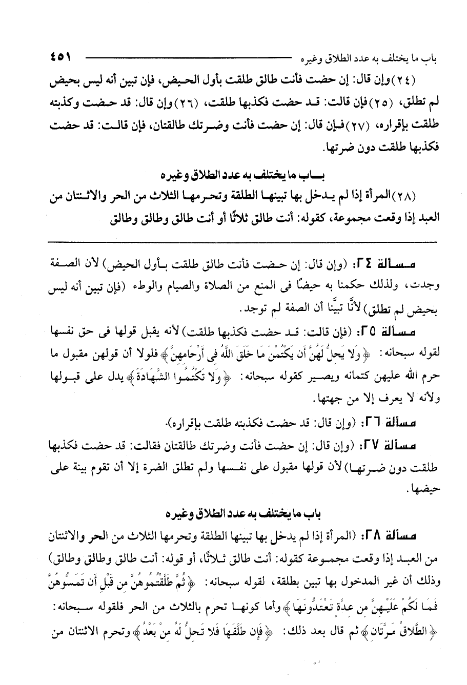 مسألة 28: (المرأة إذا لم يدخل بها تبينها الطلقة وتحرمها الثلاث من الحر والاثنتان من العبد إذا وقعت مجموعة كقوله: أنت طالق ثلاثًا أو قوله: أنت طالق وطالق وطالق) وذلك أن غير المدخول بها تبين بطلقة، لقوله سبحانه: {ثُمَّ طَلَّقْتُمُوهُنَّ مِنْ قَبْلِ أَنْ تَمَسُّوهُنَّ فَمَا لَكُمْ عَلَيْهِنَّ مِنْ عِدَّةٍ تَعْتَدُّونَهَا} [الأحزاب: 49] وأما كونها تحرم بالثلاث من الحر فلقوله سبحانه: {الطَّلاقُ مَرَّتَانِ} [البقرة: 229] ثم قال بعد ذلك: {فَإِنْ طَلَّقَهَا فَلا تَحِلُّ لَهُ مِنْ بَعْدُ} [البقرة: 230] . وتحرم الاثنتان من