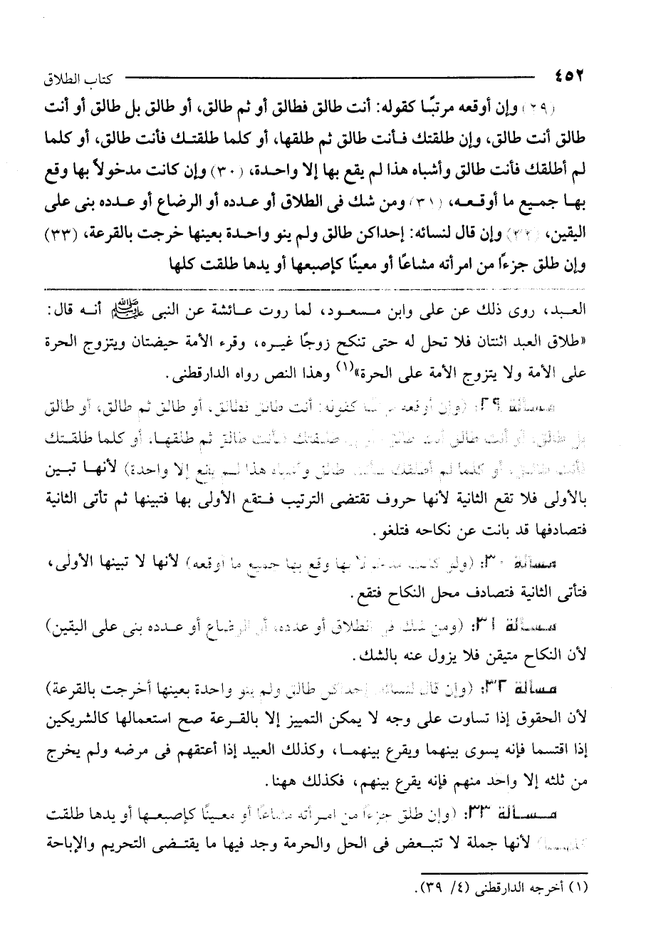 ـــــــــــــــــــــــــــــQالعبد، روي ذلك عن علي وابن مسعود، لما روت عائشة عن النبي - صَلَّى اللَّهُ عَلَيْهِ وَسَلَّمَ - أنه قال: «طلاق العبد اثنتان فلا تحل له حتى تنكح زوجًا غيره، وقرء الأمة حيضتان، ويتزوج الحرة على الأمة ولا يتزوج الأمة على الحرة» وهذا النص رواه الدارقطني.