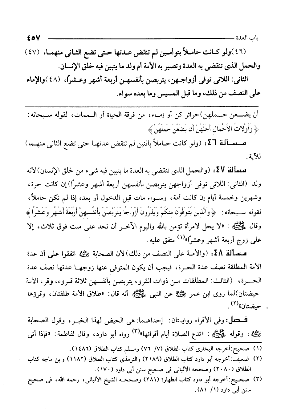 مسألة 47: (والحمل الذي تنقضي به العدة ما يتبين فيه شيء من خلق الإنسان) لأنه ولد. (الثاني: اللاتي توفي أزواجهن يتربصن بأنفسهن أربعة أشهر وعشرًا) إن كانت حرة، وشهرين وخمسة أيام إن كانت أمة، وسواء مات قبل الدخول أو بعده إذا لم تكن حاملًا، لقوله سبحانه: {وَالَّذِينَ يُتَوَفَّوْنَ مِنْكُمْ وَيَذَرُونَ أَزْوَاجًا يَتَرَبَّصْنَ بِأَنْفُسِهِنَّ أَرْبَعَةَ أَشْهُرٍ وَعَشْرًا} [البقرة: 234] وقال - صَلَّى اللَّهُ عَلَيْهِ وَسَلَّمَ -: " «لا يحل لامرأة تؤمن بالله واليوم الآخر أن تحد على ميت فوت ثلاث، إلا على زوج أربعة أشهر وعشرًا» متفق عليه.