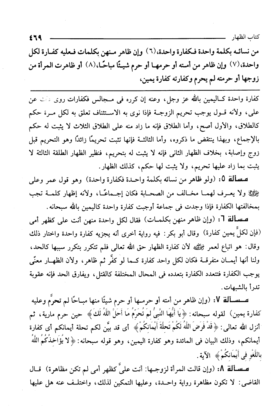 مسألة 6: (وإن ظاهر منهن بكلمات) فقال لكل واحدة منهن: أنت علي كظهر أمي (فإن لكل يمين كفارة) . وقال أبو بكر: فيه رواية أخرى أنه يجزيه كفارة واحدة واختار ذلك وقال: هو اتباع لعمر - رَضِيَ اللَّهُ عَنْهُ - لأن كفارة الظهار حق الله تعالى فلم تتكرر بتكرر سببها كالحد، ولنا أنها أيمان متفرقة فكان لكل واحد كفارة كما لو كفر ثم ظاهر، ولأن الظهار معنى يوجب الكفارة فتتعد الكفارة بتعدده في المحال المختلفة كالقتل، ويفارق الحد فإنه عقوبة تدرأ بالشبهات.