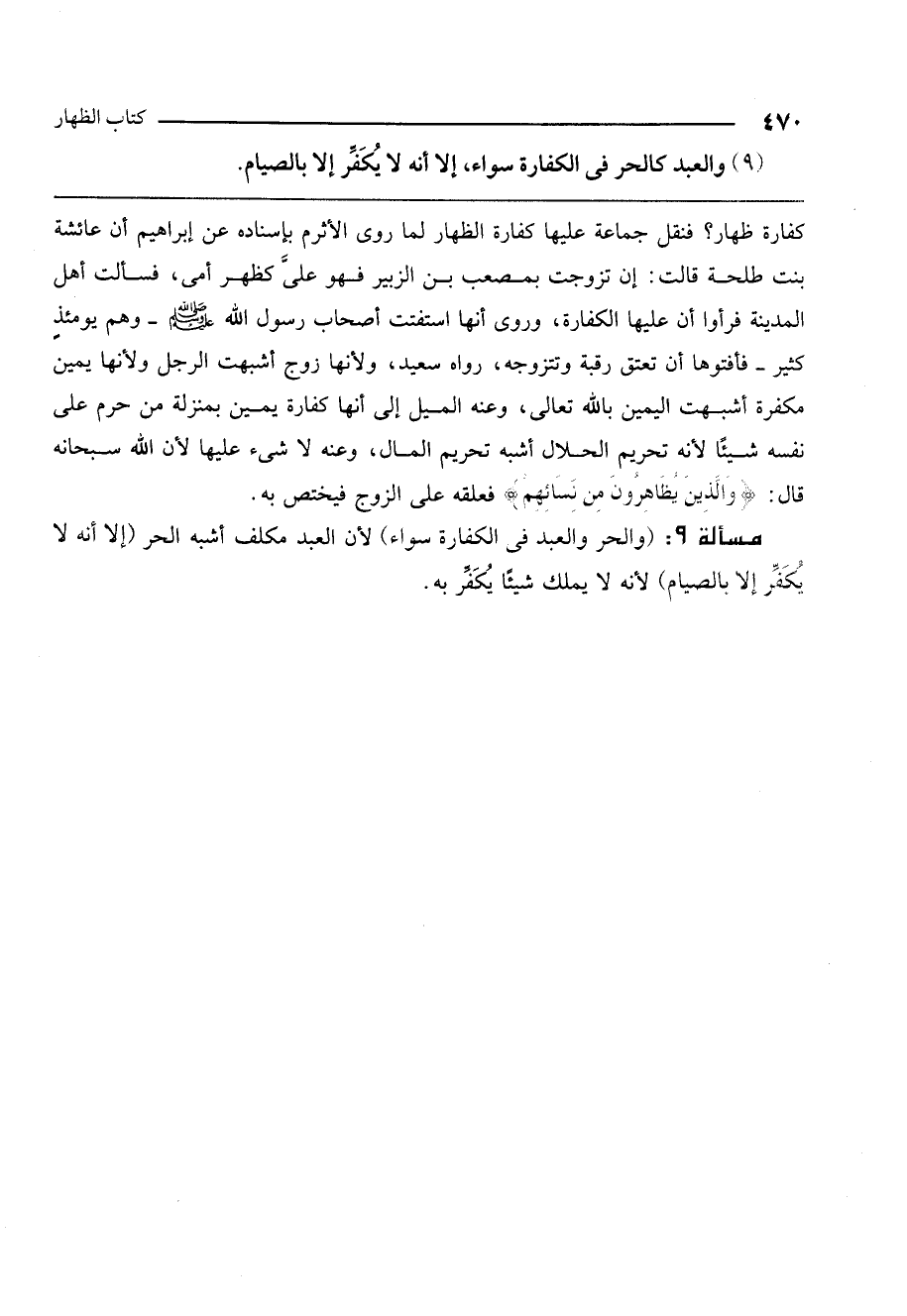 مسألة 9: (والحر والعبد في الكفارة سواء) لأن العبد مكلف أشبه الحر (إلا أنه لا يكفر إلا بالصيام) لأنه لا يملك شيئًا يكفر به.