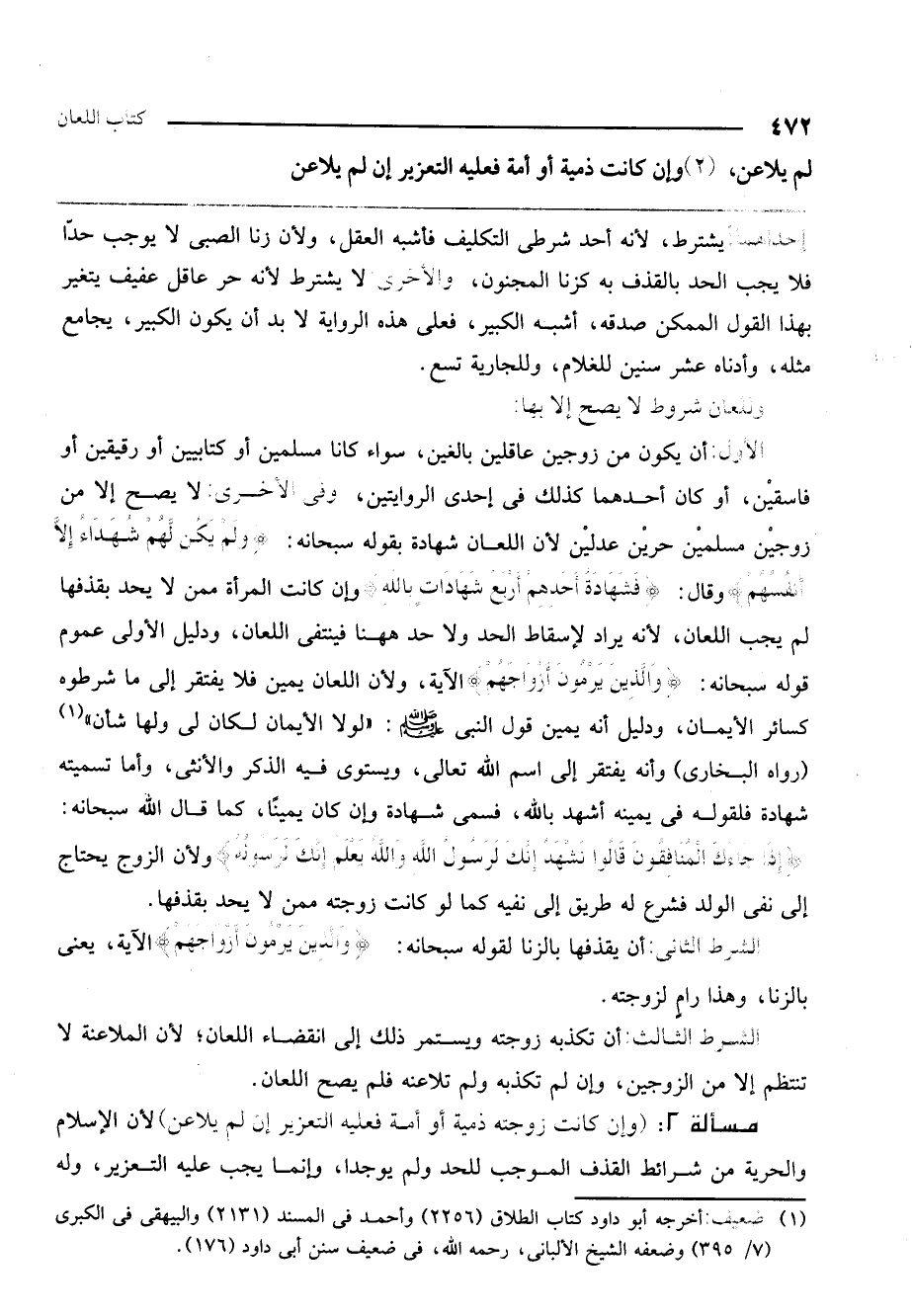 الأول: أن يكون من زوجين عاقلين بالغين، سواء كانا مسلمين أو كتابيين أو رقيقين أو فاسقين، أو كان أحدهما كذلك في إحدى الروايتين، وفي الأخرى: لا يصح إلا من زوجين مسلمين حرين عدلين لأن اللعان شهادة بقوله سبحانه: {وَلَمْ يَكُنْ لَهُمْ شُهَدَاءُ إِلا أَنْفُسُهُمْ} [النور: 6] وقال: {فَشَهَادَةُ أَحَدِهِمْ أَرْبَعُ شَهَادَاتٍ بِاللَّهِ} [النور: 6] وإن كانت المرأة ممن لا يحد بقذفها لم يجب اللعان، لأنه يراد لإسقاط الحد ولا حد هاهنا فينتفي اللعان. ودليل الأولى عموم قوله سبحانه: {وَالَّذِينَ يَرْمُونَ أَزْوَاجَهُمْ} [النور: 6] الآية، ولأن اللعان يمين فلا يفتقر إلى ما شرطوه كسائر الأيمان، ودليل أنه يمين قول النبي - صَلَّى اللَّهُ عَلَيْهِ وَسَلَّمَ -: " «لولا الأيمان لكان لي ولها شأن» (رواه البخاري) وأنه يفتقر إلى اسم الله تعالى، ويستوي فيه الذكر والأنثى. وأما تسميته شهادة فلقوله في يمينه أشهد بالله، فسمي شهادة وإن كان يمينًا، كما قال الله سبحانه: {إِذَا جَاءَكَ الْمُنَافِقُونَ قَالُوا نَشْهَدُ إِنَّكَ لَرَسُولُ اللَّهِ وَاللَّهُ يَعْلَمُ إِنَّكَ لَرَسُولُهُ} [المنافقون: 1] ، ولأن الزوج يحتاج إلى نفي الولد فشرع له طريق إلى نفيه كما لو كانت زوجته ممن لا يحد بقذفها.