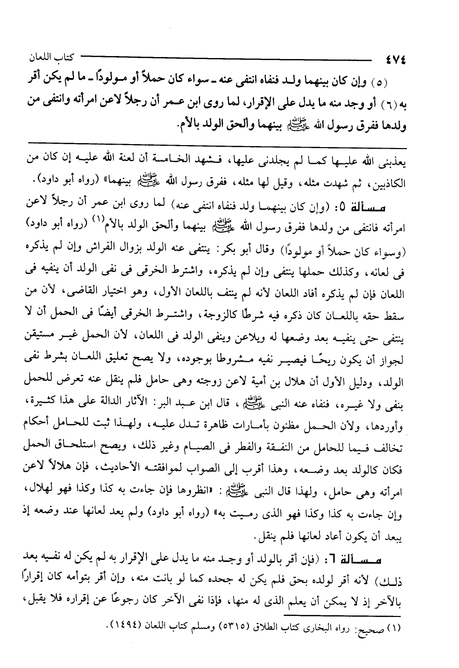 مسألة 5: (وإن كان بينهما ولد فنفاه انتفى عنه) لما روى ابن عمر «أن رجلًا لاعن امرأته فانتفى من ولدها ففرق رسول الله - صَلَّى اللَّهُ عَلَيْهِ وَسَلَّمَ - بينهما وألحق الولد بالأم» (رواه أبو داود) (وسواء كان حملًا أو مولودًا) وقال أبو بكر: ينتفي عنه الولد بزوال الفراش وإن لم يذكره في لعانه، وكذلك حملها ينتفي وإن لم يذكره، واشترط الخرقي في نفي الولد أن ينفيه في اللعان فإن لم يذكره أفاد اللعان لأنه لم ينتف باللعان الأول، وهو اختيار القاضي، لأن من سقط حقه باللعان كان ذكره فيه شرطًا كالزوجة، واشترط الخرقي أيضًا في الحمل أن لا ينتفي حتى ينفيه وضعها له ويلاعن وينفي الولد في اللعان، لأن الحمل غير مستيقن لجواز أن يكون ريحًا فيصير نفيه مشروطًا بوجوده. ولا يصح تعليق اللعان بشرط نفي الولد، ودليل الأول «أن هلال بن أمية لاعن زوجته وهي حامل فلم ينقل عنه تعرض للحمل بنفي ولا غيره، فنفاه عنه النبي - صَلَّى اللَّهُ عَلَيْهِ وَسَلَّمَ -» . قال ابن عبد البر: الآثار الدالة على هذا كثيرة، وأوردها، ولأن الحمل مظنون بأمارات ظاهرة تدل عليه، ولهذا ثبت للحامل أحكام تخالف فيما للحامل من النفقة والفطر في الصيام وغير ذلك، ويصح استلحاق الحمل فكان كالولد بعد وضعه، وهذا أقرب إلى الصواب لموافقته الأحاديث، فإن هلالًا لاعن امرأته وهي حامل، ولهذا قال النبي - صَلَّى اللَّهُ عَلَيْهِ وَسَلَّمَ -: " «انظروها فإن جاءت به كذا وكذا فهو لهلال، وإن جاءت به كذا وكذا فهو الذي رميت به» (رواه أبو داود) ولم يعد لعانها عند وضعه إذ يبعد أن يكون أعاد لعانها فلم ينقل.