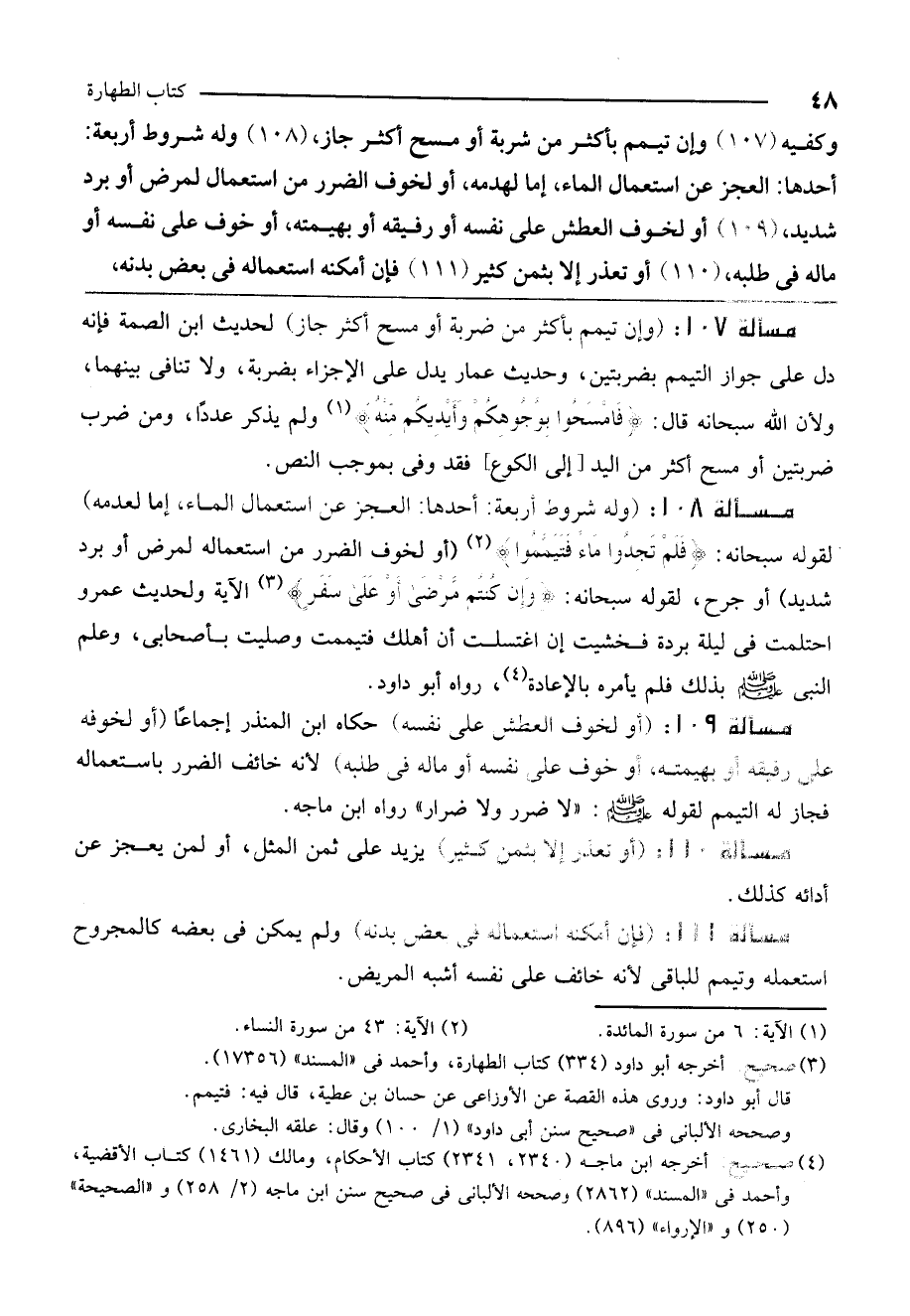 مسألة 108: (وله شروط أربعة: أحدها: العجز عن استعمال الماء، إما لعدمه) لقوله سبحانه: {فَلَمْ تَجِدُوا مَاءً فَتَيَمَّمُوا} [النساء: 43] (أو لخوف الضرر من استعماله لمرض أو برد شديد) أو جرح، لقوله سبحانه: {وَإِنْ كُنْتُمْ مَرْضَى أَوْ عَلَى سَفَرٍ} [النساء: 43] الآية «ولحديث عمرو: احتلمت في ليلة باردة فخشيت إن اغتسلت أن أهلك فتيممت وصليت بأصحابي، وعلم النبي - صَلَّى اللَّهُ عَلَيْهِ وَسَلَّمَ - بذلك فلم يأمره بالإعادة» ، رواه أبو داود.