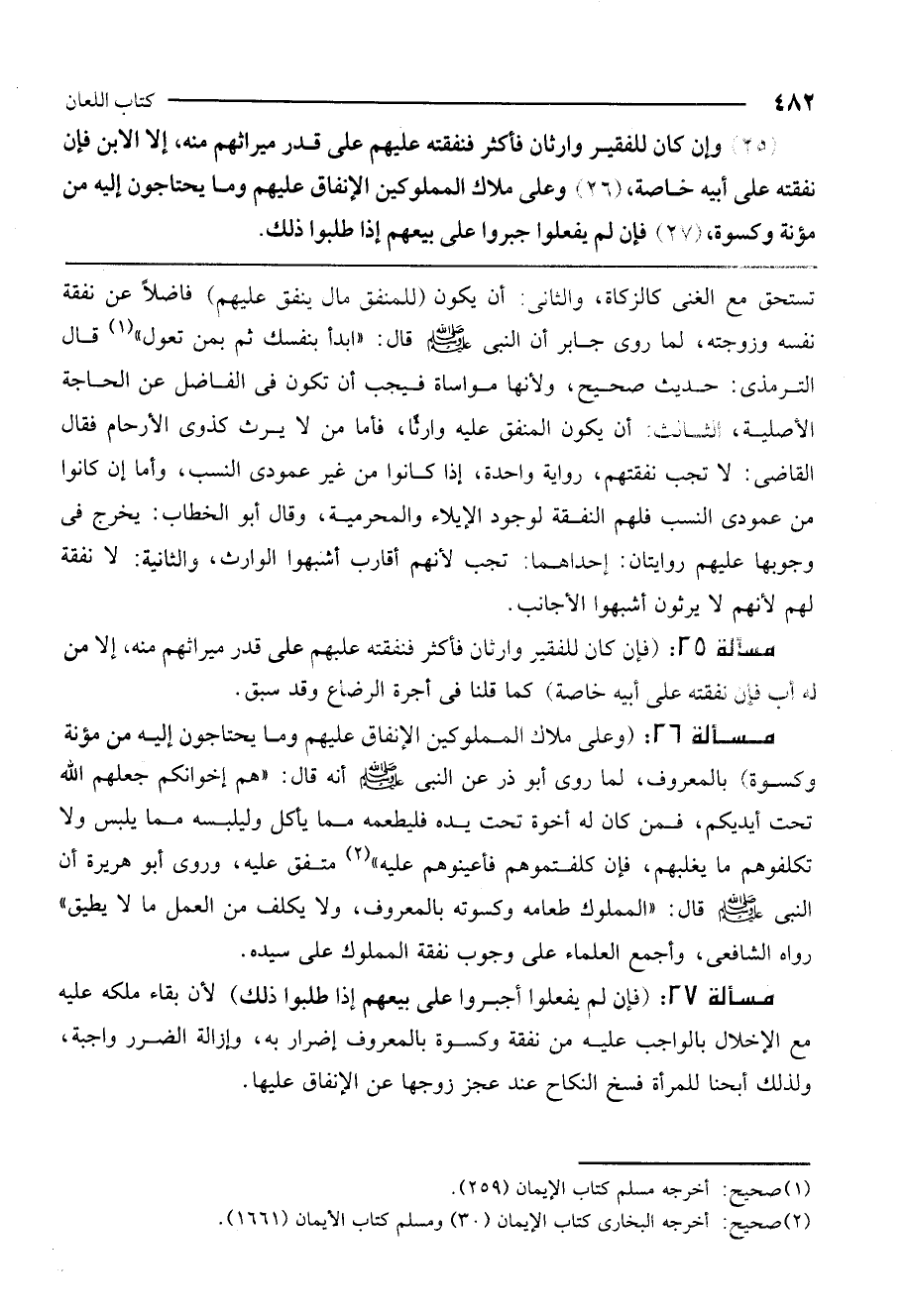 مسألة 26: (وعلى ملاك المملوكين الإنفاق عليهم وما يحتاجون إليه من مؤنة وكسوة) بالمعروف، لما روى أبو ذر عن النبي - صَلَّى اللَّهُ عَلَيْهِ وَسَلَّمَ - أنه قال: «هم إخوانكم جعلهم الله تحت أيديكم، فمن كان له أخوة تحت يده فليطعمه مما يأكل وليلبسه مما يلبس ولا تكلفوهم ما يغلبهم، فإن كلفتموهم فأعينوهم عليه» متفق عليه. وروى أبو هريرة أن النبي - صَلَّى اللَّهُ عَلَيْهِ وَسَلَّمَ - قال: «المملوك طعامه وكسوته بالمعروف، ولا يكلف من العمل ما لا يطيق» رواه الشافعي، وأجمع العلماء على وجوب نفقة المملوك على سيده.