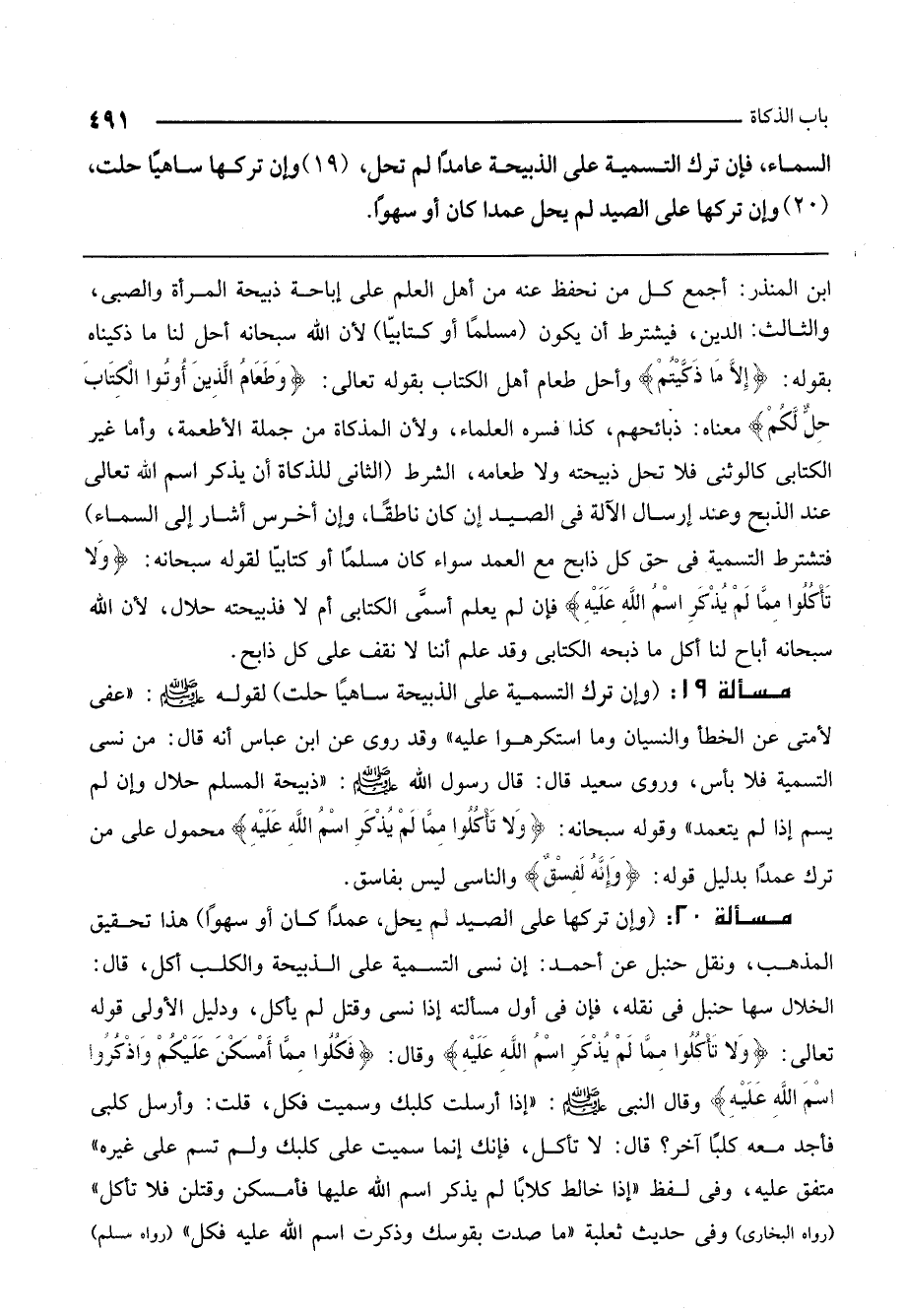 مسألة 20: (وإن تركها على الصيد لم يحل، عمدًا كان أو سهوًا) هذا تحقيق المذهب، ونقل حنبل عن أحمد: إن نسي التسمية على الذبيحة والكلب أكل، قال الخلال: سها حنبل في نقله، فإن في أول مسألته إذا نسي وقتل لم يأكل، ودليل الأولى قَوْله تَعَالَى: {وَلا تَأْكُلُوا مِمَّا لَمْ يُذْكَرِ اسْمُ اللَّهِ عَلَيْهِ} [الأنعام: 121] وقال: {فَكُلُوا مِمَّا أَمْسَكْنَ عَلَيْكُمْ وَاذْكُرُوا اسْمَ اللَّهِ} [المائدة: 4] وقال النبي - صَلَّى اللَّهُ عَلَيْهِ وَسَلَّمَ -: " «إذا أرسلت كلبك وسميت فكل. قلت: وأرسل كلبي فأجد معه كلبًا آخر؟ قال: لا تأكل، فإنك إنما سميت على كلبك ولم تسم على غيره» متفق عليه، وفي لفظ " «إذا خالط كلابًا لم يذكر اسم الله عليها فأمسكن وقتلن فلا تأكل» (رواه البخاري) وفي حديث ثعلبة «ما صدت بقوسك وذكرت اسم الله عليه فكل» (رواه مسلم)