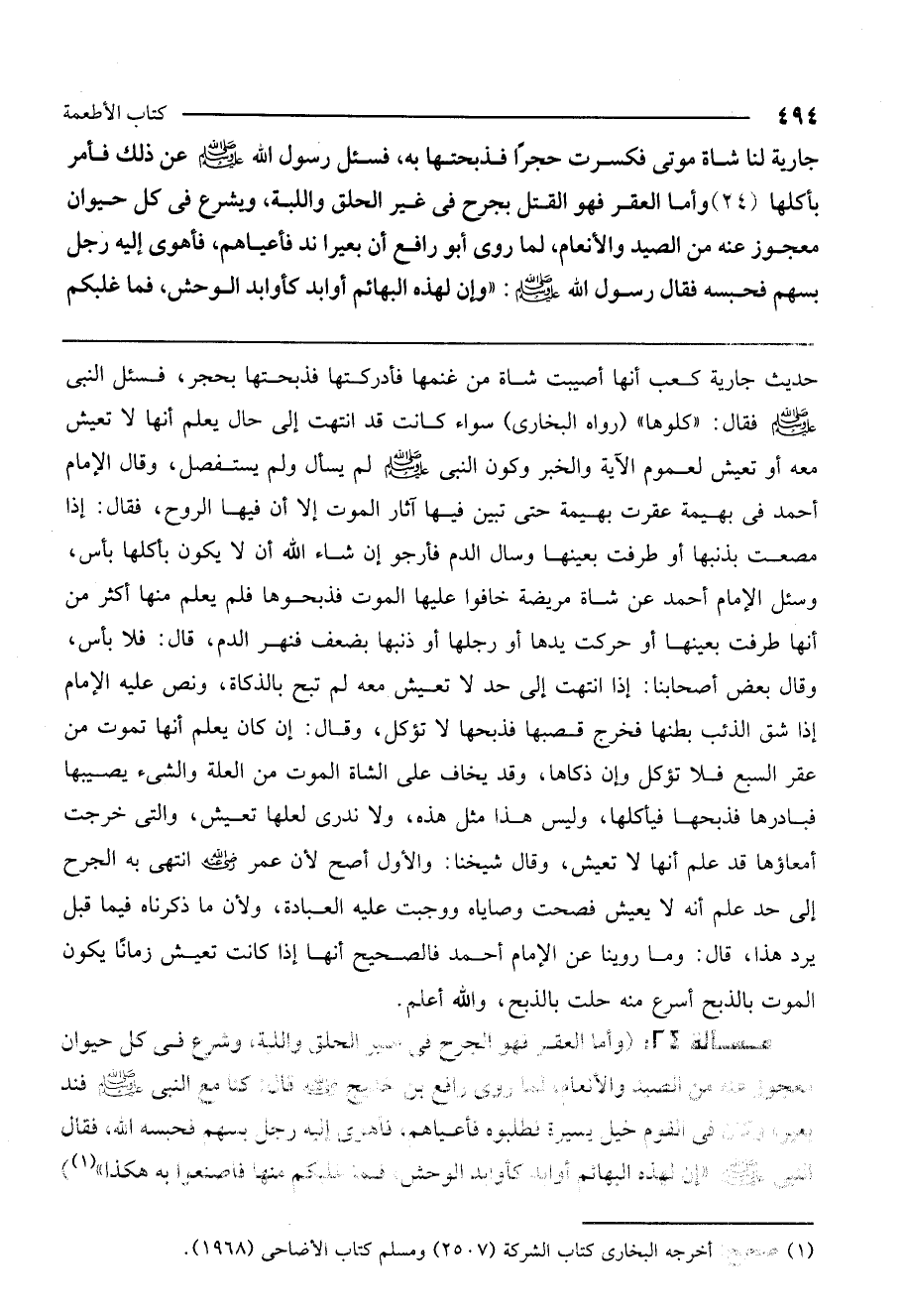 ـــــــــــــــــــــــــــــQحديث «جارية كعب أنها أصيبت شاة من غنمها فأدركتها فذبحتها بحجر، فسئل النبي - صَلَّى اللَّهُ عَلَيْهِ وَسَلَّمَ - فقال: " كلوها» (رواه البخاري) سواء كانت قد انتهت إلى حال يعلم أنها لا تعيش معه أو تعيش لعموم الآية والخبر وكون النبي - صَلَّى اللَّهُ عَلَيْهِ وَسَلَّمَ - لم يسأل ولم يستفصل، وقال الإمام أحمد في بهيمة عقرت بهيمة حتى تبين فيها آثار الموت إلا أن فيها الروح، فقال: إذا مصعت بذنبها أو طرفت بعينها وسال الدم فأرجو إن شاء الله أن لا يكون بأكلها بأس، وسئل الإمام أحمد عن شاة مريضة خافوا عليها الموت فذبحوها فلم يعلم منها أكثر من أنها طرفت بعينها أو حركت يدها أو رجلها أو ذنبها بضعف فنهر الدم، قال: فلا بأس، وقال بعض أصحابنا: إذا انتهت إلى حد لا تعيش معه لم تبح بالذكاة، ونص عليه الإمام إذا شق الذئب بطنها فخرج قصبها فذبحها لا تؤكل، وقال: إن كان يعلم أنها تموت من عقر السبع فلا تؤكل وإن ذكاها، وقد يخاف على الشاة الموت من العلة والشيء يصيبها فبادرها فذبحها فيأكلها، وليس هذا مثل هذه، ولا ندري لعلها تعيش، والتي خرجت أمعاؤها قد علم أنها لا تعيش، وقال شيخنا: والأول أصح لأن عمر - رَضِيَ اللَّهُ عَنْهُ - انتهى به الجرح إلى حد علم أنه لا يعيش فصحت وصاياه ووجبت عليه العبادة، ولأن ما ذكرناه فيما قبل يرد هذا، قال: وما رويناه عن الإمام أحمد فالصحيح أنها إذا كانت تعيش زمانًا يكون الموت بالذبح أسرع منه حلت بالذبح. والله أعلم.
