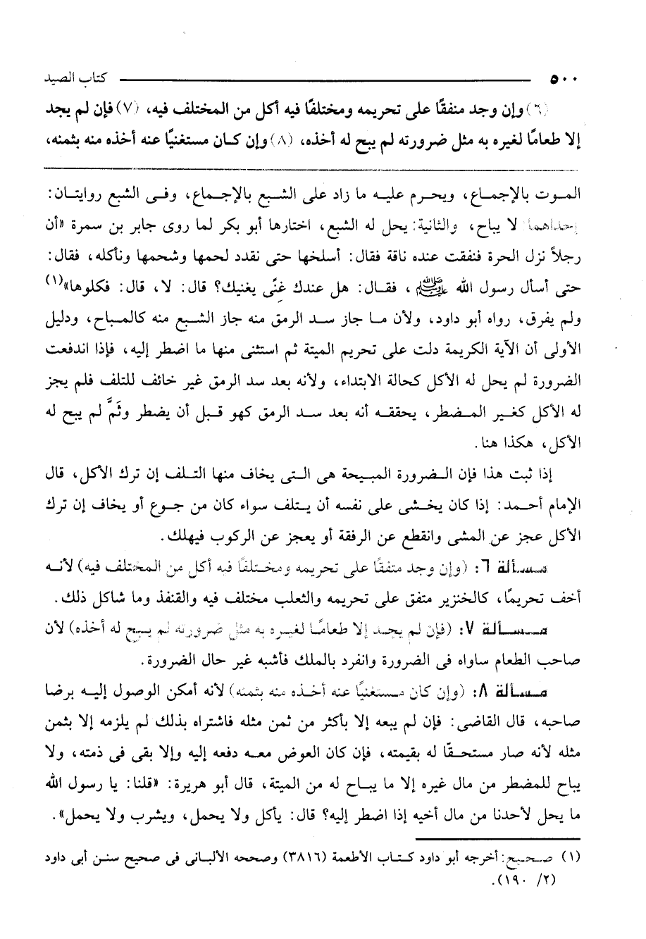 ـــــــــــــــــــــــــــــQالموت بالإجماع، ويحرم عليه ما زاد على الشبع بالإجماع، وفي الشبع روايتان: أحدهما: لا يباح، والثانية: يحل له الشبع، اختارها أبو بكر لما روى جابر بن سمرة «أن رجلًا نزل الحرة فنفقت عنده ناقة فقال: اسلخها حتى نقدد لحمها وشحمها ونأكله، فقال: حتى أسأل رسول الله - صَلَّى اللَّهُ عَلَيْهِ وَسَلَّمَ -، فقال: هل عندك غنى يغنيك؟ قال: لا. قال: فكلوها» ولم يفرق، رواه أبو داود. ولأن ما جاز سد الرمق منه جاز الشبع منه كالمباح، ودليل الأولى أن الآية الكريمة دلت على تحريم الميتة ثم استثنى منها ما اضطر إليه، فإذا اندفعت الضرورة لم يحل له الأكل كحالة الابتداء، ولأنه بعد سد الرمق غير خائف للتلف فلم يجز له الأكل كغير المضطر، يحققه أنه بعد سد الرمق كهو قبل أن يضطر وثَمّ لم يبح له الأكل، هكذا هنا.