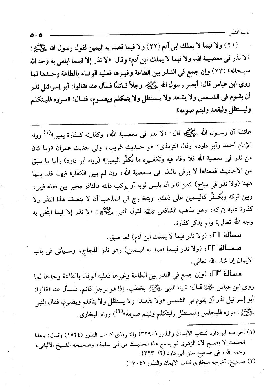 مسألة 23: (وإن جمع في النذر بين الطاعة وغيرها فعليه الوفاء بالطاعة وحدها لما روى ابن عباس، - رَضِيَ اللَّهُ عَنْهُمَا - قال: «بينا النبي - صَلَّى اللَّهُ عَلَيْهِ وَسَلَّمَ - يخطب، إذا هو برجل قائم، فسأل عنه فقالوا: أبو إسرائيل نذر أن يقوم في الشمس " ولا يقعد " ولا يستظل ولا يتكلم ويصوم، فقال النبي - صَلَّى اللَّهُ عَلَيْهِ وَسَلَّمَ -: مروه فليجلس وليستظل وليتكلم وليتم صومه» رواه البخاري.