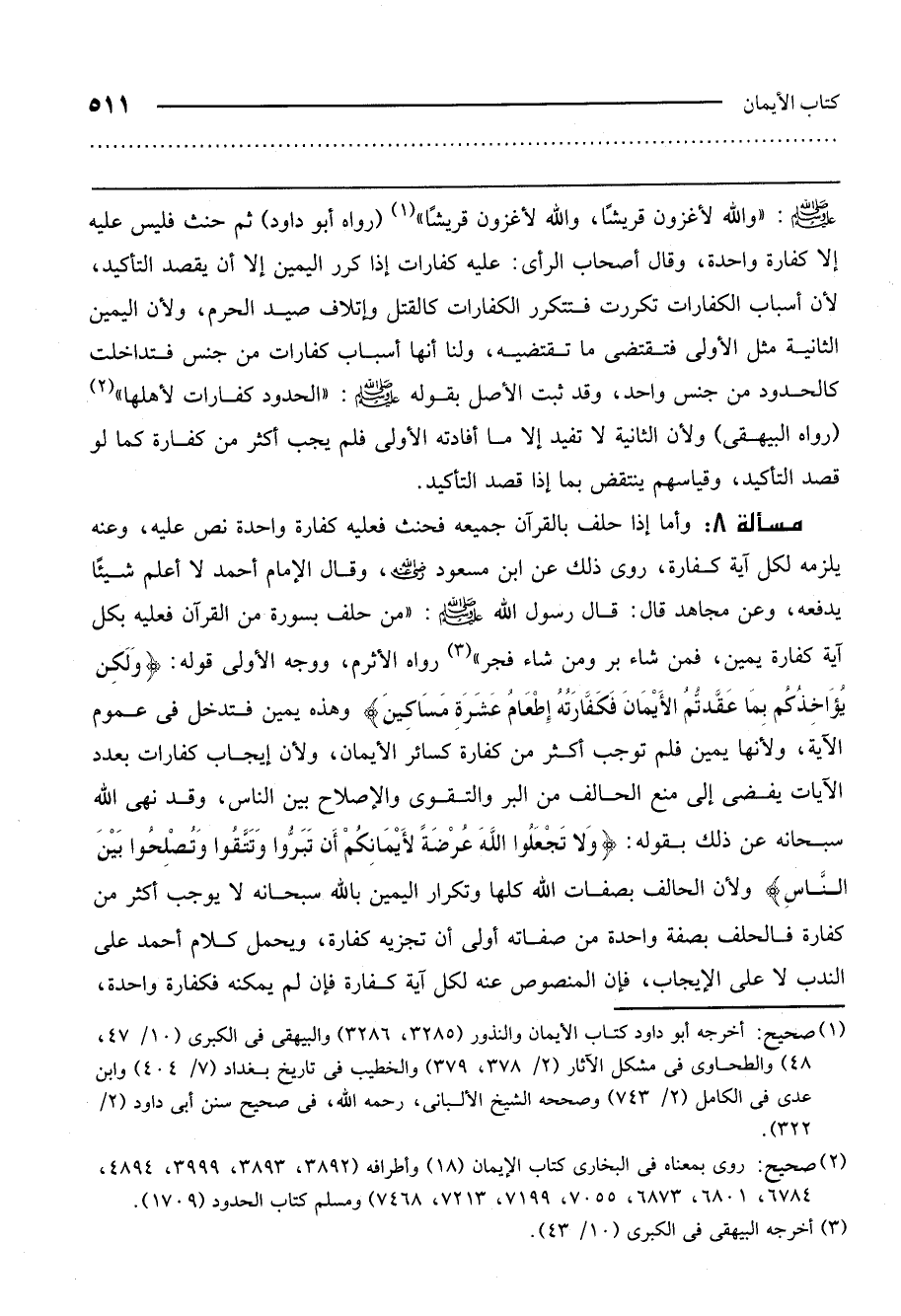ـــــــــــــــــــــــــــــQ- صَلَّى اللَّهُ عَلَيْهِ وَسَلَّمَ -: " «والله لأغزون قريشًا، والله لأغزون قريشًا» (رواه أبو داود) ثم حنث فليس عليه إلا كفارة واحدة، وقال أصحاب الرأي: عليه كفارات إذا كرر اليمين إلا أن يقصد التأكيد، لأن أسباب الكفارات تكررت فتتكرر الكفارات كالقتل وإتلاف صيد الحرم، ولأن اليمين الثانية مثل الأولى فتقتضي ما تقتضيه، ولنا أنها أسباب كفارات من جنس فتداخلت كالحدود من جنس واحد، وقد ثبت الأصل بقوله - صَلَّى اللَّهُ عَلَيْهِ وَسَلَّمَ -: " «الحدود كفارات لأهلها» (رواه البيهقي) ، ولأن الثانية لا تفيد إلا ما أفادته الأولى فلم يجب أكثر من كفارة كما لو قصد التأكيد، وقياسهم ينتقض بما إذا قصد التأكيد.