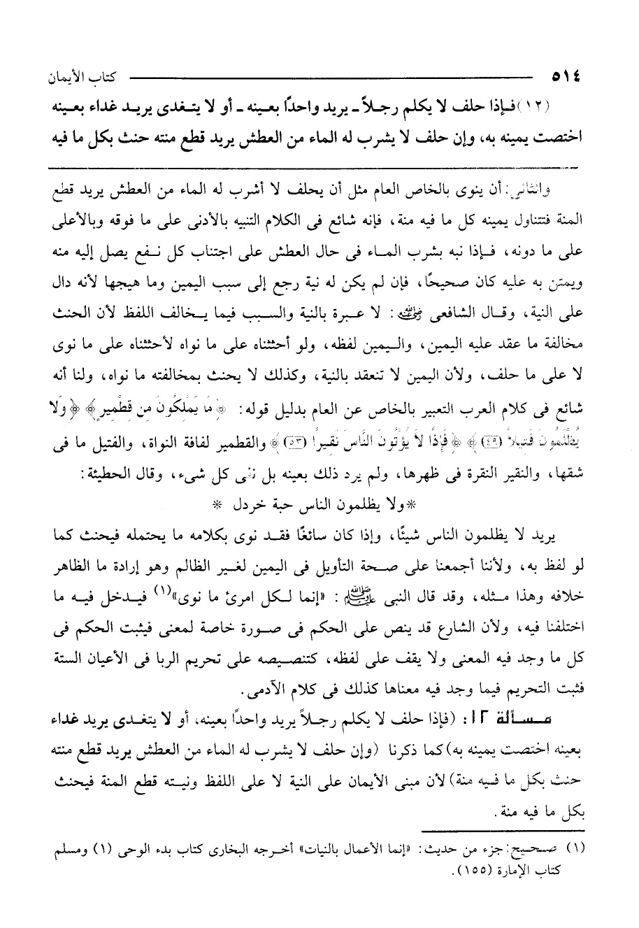يريد لا يظلمون الناس شيئا، وإذا كان سائغا فقد نوى بكلامه ما يحتمله فيحنث كما لو لفظ به، ولأننا أجمعنا على صحة التأويل في اليمين لغير الظالم، وهو إرادة ما الظاهر خلافه وهذا مثله، وقد قال النبي - صَلَّى اللَّهُ عَلَيْهِ وَسَلَّمَ -: «إنما لكل امرئ ما نوى» ، فيدخل فيه ما اختلفنا فيه، ولأن الشارع قد ينص على الحكم في صورة خاصة لمعنى، فيثبت الحكم في كل ما وجد فيه المعنى ولا يقف على لفظه، كتنصيصه على تحريم الربا في الأعيان الستة، فثبت التحريم فيما وجد فيه معناها كذلك في كلام الآدمي.