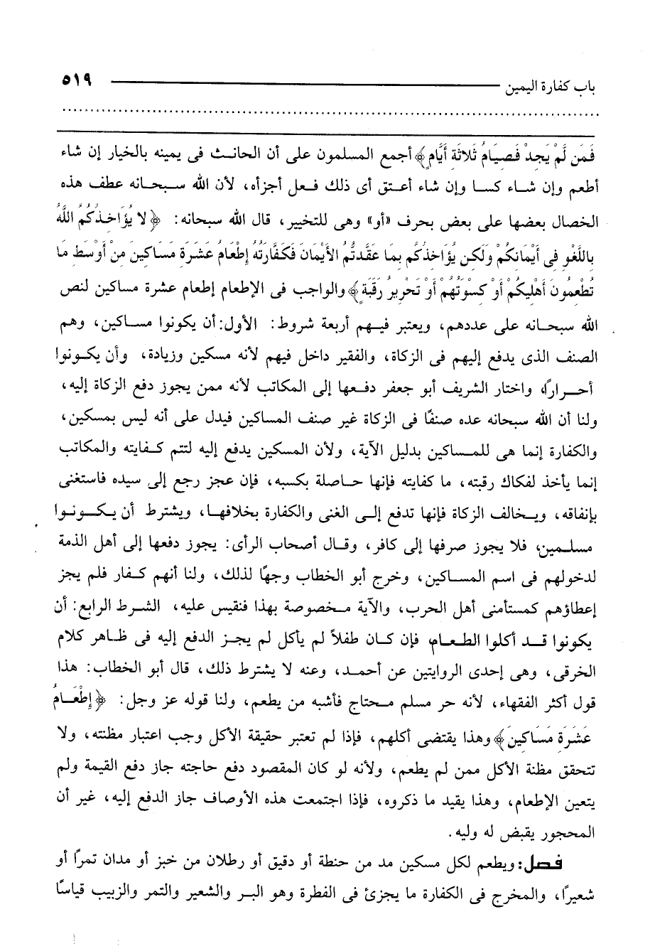 ـــــــــــــــــــــــــــــQأجمع المسلمون على أن الحانث في يمينه بالخيار، إن شاء أطعم، وإن شاء كسا، وإن شاء أعتق، أي ذلك فعل أجزأه؛ لأن الله سبحانه عطف هذه الخصال بعضها على بعض بحرف " أو " وهى للتخيير، قال الله سبحانه: {لا يُؤَاخِذُكُمُ اللَّهُ بِاللَّغْوِ فِي أَيْمَانِكُمْ وَلَكِنْ يُؤَاخِذُكُمْ بِمَا عَقَّدْتُمُ الأَيْمَانَ فَكَفَّارَتُهُ إِطْعَامُ عَشَرَةِ مَسَاكِينَ مِنْ أَوْسَطِ مَا تُطْعِمُونَ أَهْلِيكُمْ أَوْ كِسْوَتُهُمْ أَوْ تَحْرِيرُ رَقَبَةٍ} [المائدة: 89] ، والواجب في الإطعام إطعام عشرة مساكين؛ لنص الله سبحانه على عددهم، ويعتبر فيهم أربعة شروط: