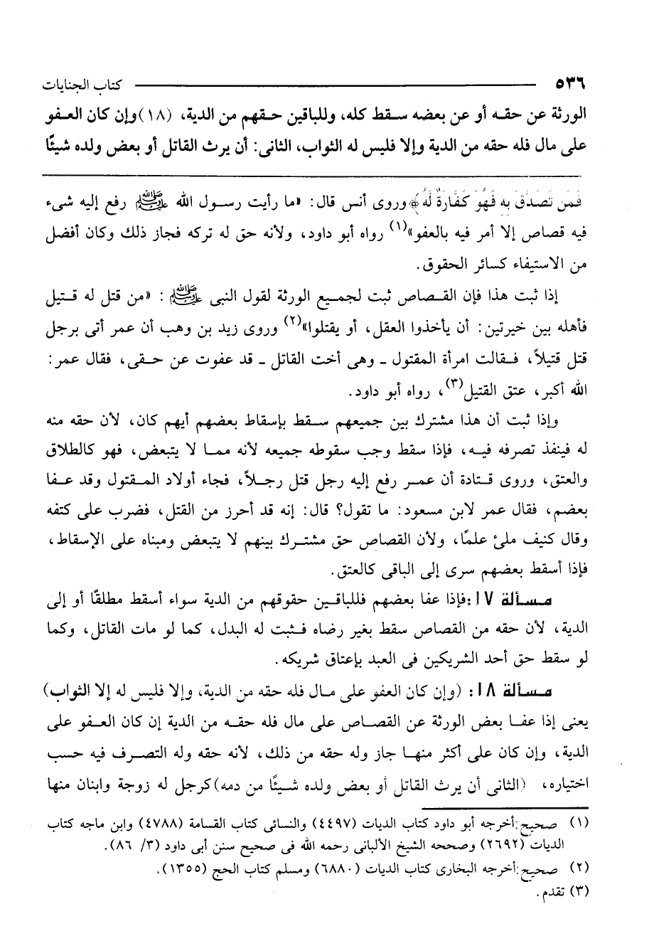 ـــــــــــــــــــــــــــــQوروى أنس قال: «ما رأيت رسول الله - صَلَّى اللَّهُ عَلَيْهِ وَسَلَّمَ - رفع إليه شيء فيه قصاص إلا أمر فيه بالعفو» رواه أبو داود؛ ولأنه حق له تركه فجاز ذلك وكان أفضل من الاستيفاء كسائر الحقوق.
