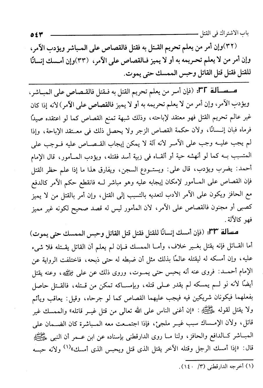 مسألة 33: (فإن أمسك إنسانا للقتل فقتل، قتل القاتل وحبس الممسك حتى يموت) أما القاتل فإنه يقتل بغير خلاف، وأما الممسك فإن لم يعلم أن القاتل يقتله فلا شيء عليه، وإن أمسكه له ليقتله عالما بذلك مثل أن ضبطه له حتى ذبحه، فاختلفت الرواية عن الإمام أحمد: فروي عنه أنه يحبس حتى يموت، وروي ذلك عن علي - رَضِيَ اللَّهُ عَنْهُ -، وعنه: يقتل أيضا؛ لأنه لو لم يمسكه لم يقدر على قتله، وبإمساكه تمكن من قتله، فالقتل حاصل بفعلهما فيكونان شريكين فيه فيجب عليهما القصاص كما لو جرحاه، وقيل: يعاقب ويأثم ولا يقتل؛ لقوله - صَلَّى اللَّهُ عَلَيْهِ وَسَلَّمَ -: «إن أعدى الناس على الله تعالى من قتل غير قاتله» ، والممسك غير قاتل، ولأن الإمساك سبب غير ملجئ، فإذا اجتمعت معه المباشرة كان الضمان على المباشر كالدافع والحافز، ولنا ما روى الدارقطني بإسناده عن ابن عمر أن النبي - صَلَّى اللَّهُ عَلَيْهِ وَسَلَّمَ - قال: «إذا أمسك الرجل وقتله الآخر يقتل الذي قتل ويحبس الذي أمسك» ؛ ولأنه حبسه