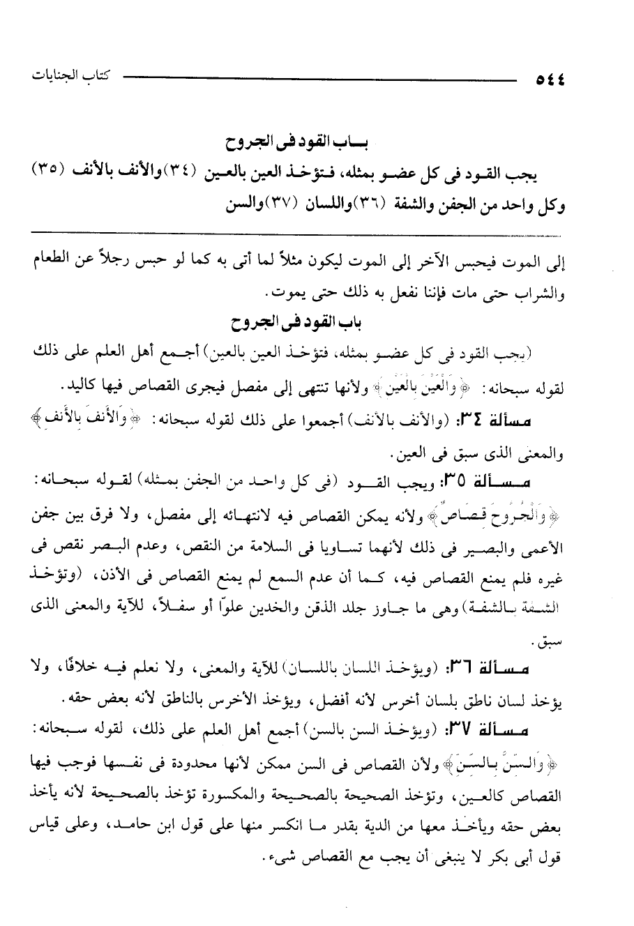 باب القود في الجروح يجب القود في كل عضو بمثله، فتؤخذ العين بالعين