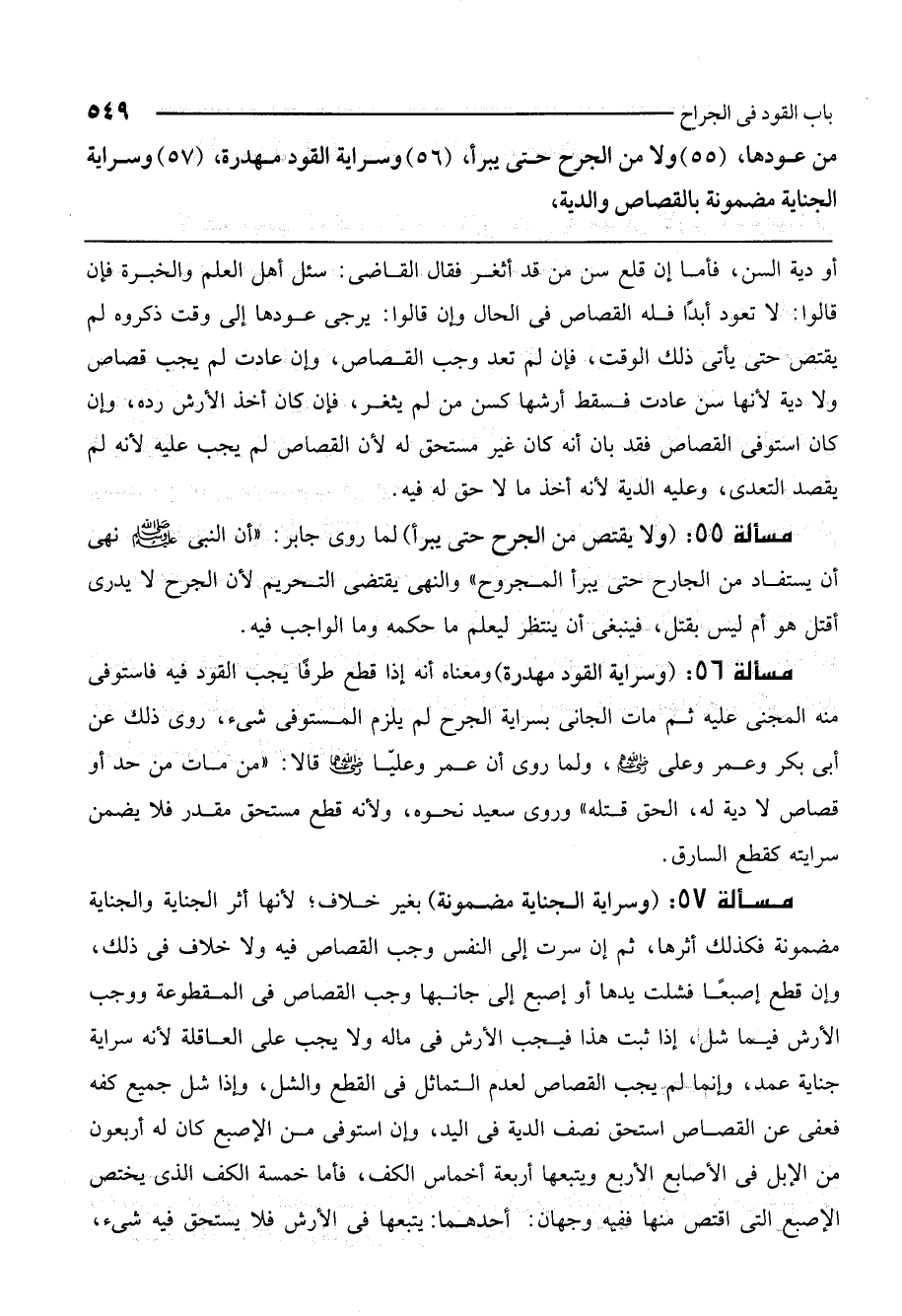 مسألة 55: (ولا يقتص من الجرح حتى يبرأ) ؛ لما روى جابر: «أن النبي - صَلَّى اللَّهُ عَلَيْهِ وَسَلَّمَ - نهى أن يستقاد من الجارح حتى يبرأ المجروح» ، والنهي يقتضي التحريم؛ لأن الجرح لا يدرى أقتل هو أم ليس بقتل، فينبغي أن ينتظر ليعلم ما حكمه وما الواجب فيه.