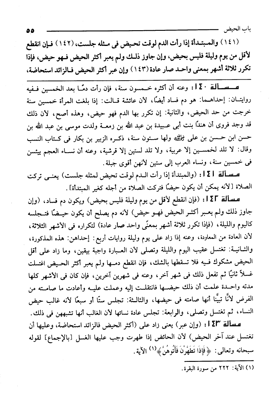 ـــــــــــــــــــــــــــــQمسألة 140: وعنه أن أكثره خمسون سنة، فإن رأت دماً بعد الخمسين ففيه روايتان: إحداهما: هو دم فساد أيضاً، لأن عائشة قالت: إذا بلغت المرأة خمسين سنة خرجت من حد الحيض، والثانية: إن تكرر بها الدم فهو حيض، وهذه أصح؛ لأن ذلك قد وجد فروي أن هند بنت أبي عبيدة بن عبد الله بن زمعة ولدت موسى بن عبد الله بن حسن بن حسن بن علي - رَضِيَ اللَّهُ عَنْهُ - ولها ستون سنة، ذكره الزبير بن بكار في كتاب النسب وقال: لا تلد لخمسين إلا عربية، ولا تلد لستين إلا قرشية، وعنه أن نساء العجم ييئسن في خمسين سنة، ونساء العرب إلى ستين لأنهن أقوى جبلة.