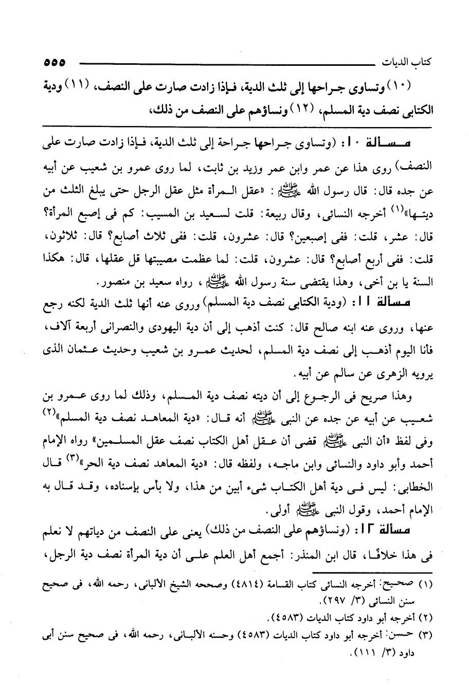 ـــــــــــــــــــــــــــــQمسألة 10: (وتساوي جراحها جراحة إلى ثلث الدية، فإذا زادت صارت على النصف) روي هذا عن عمر وابن عمر وزيد بن ثابت، لما روى عمرو بن شعيب عن أبيه عن جده قال: قال رسول الله - صَلَّى اللَّهُ عَلَيْهِ وَسَلَّمَ -: «عقل المرأة مثل عقل الرجل حتى يبلغ الثلث من ديتها» أخرجه النسائي، وقال ربيعة: قلت لسعيد بن المسيب: كم في إصبع المرأة؟ قال: عشر، قلت: ففي إصبعين؟ قال: عشرون، قلت: ففي ثلاث أصابع؟ قال: ثلاثون، قلت: ففي أربع أصابع؟ قال: عشرون، قلت: لما عظمت مصيبتها قل عقلها، قال: هكذا السنة يا ابن أخي. وهذا يقتضي سنة رسول الله - صَلَّى اللَّهُ عَلَيْهِ وَسَلَّمَ -، رواه سعيد بن منصور.