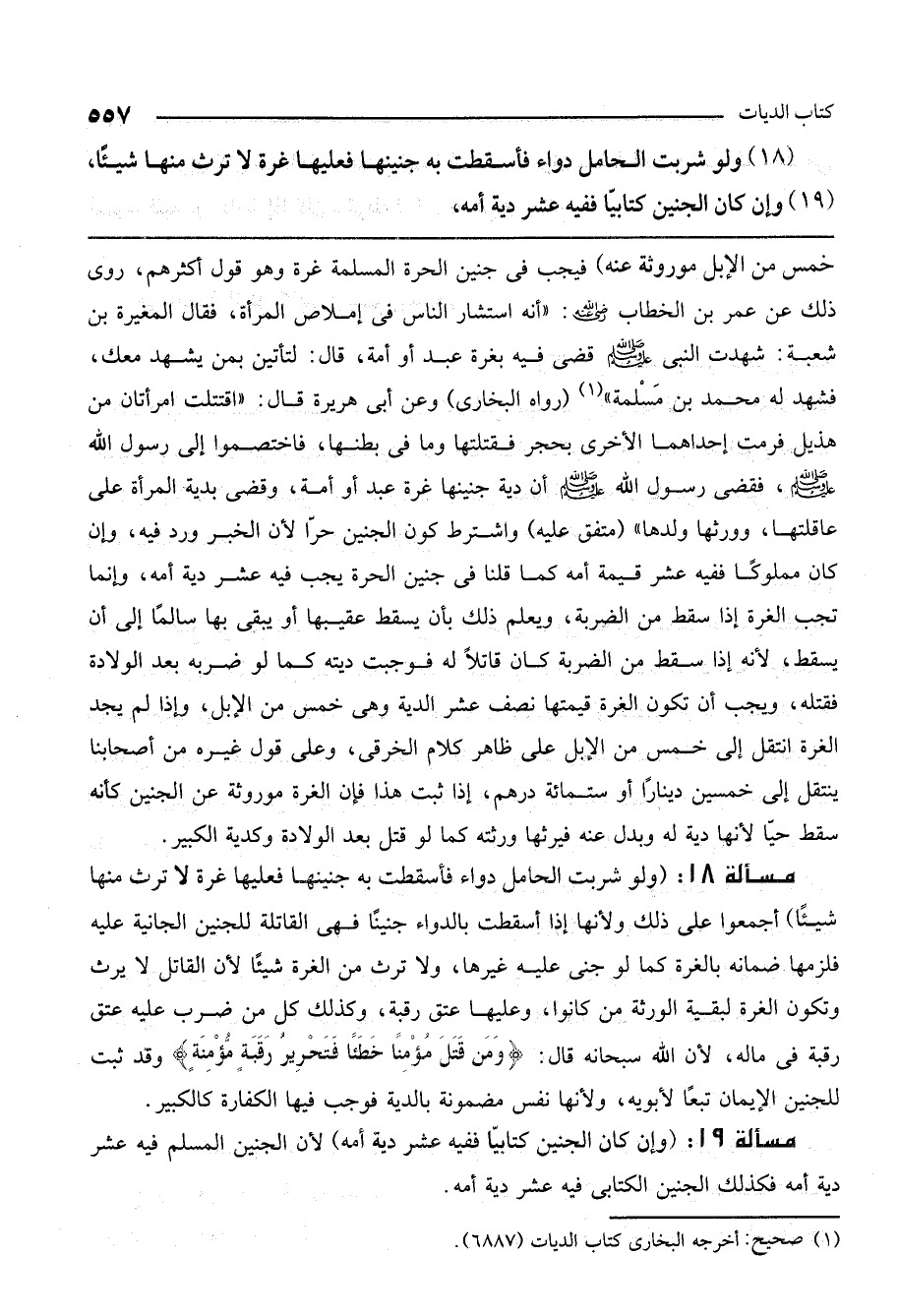 مسألة 18: (ولو شربت الحامل دواء فأسقطت به جنينها فعليها غرة لا ترث منها شيئا) أجمعوا على ذلك ولأنها إذا أسقطت بالدواء جنينا فهي القاتلة للجنين الجانية عليه، فلزمها ضمانه بالغرة كما لو جنى عليه غيرها، ولا ترث من الغرة شيئا؛ لأن القاتل لا يرث وتكون الغرة لبقية الورثة من كانوا، وعليها عتق رقبة، وكذلك كل من ضرب عليه عتق رقبة في ماله؛ لأن الله سبحانه قال: {وَمَنْ قَتَلَ مُؤْمِنًا خَطَأً فَتَحْرِيرُ رَقَبَةٍ مُؤْمِنَةٍ} [النساء: 92] ، وقد ثبت للجنين الإيمان تبعا لأبويه، ولأنها نفس مضمونة بالدية فوجب فيها الكفارة كالكبير.