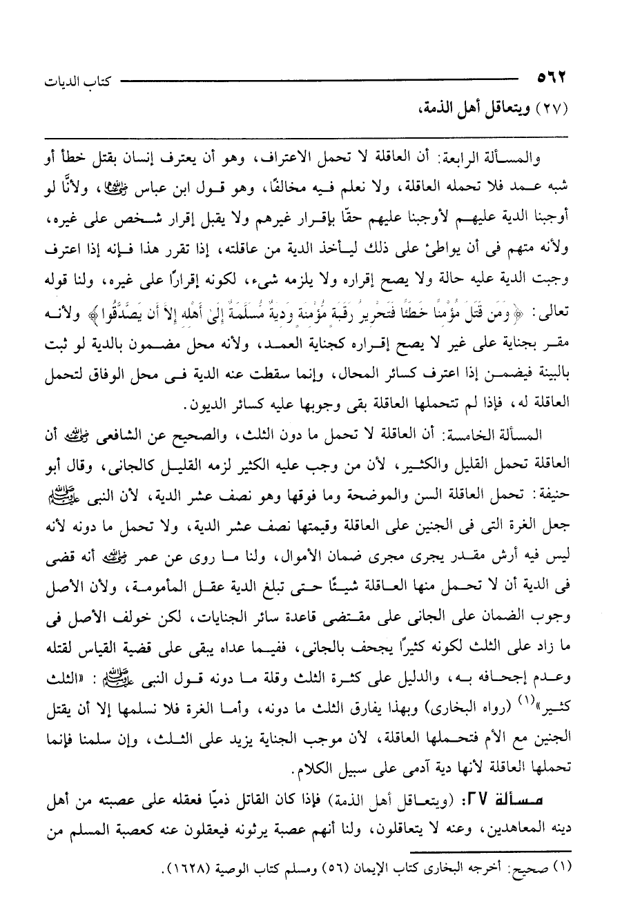 مسألة 27: (ويتعاقل أهل الذمة) فإذا كان القاتل ذميا فعقله على عصبته من أهل دينه المعاهدين، وعنه لا يتعاقلون، ولنا أنهم عصبة يرثونه فيعقلون عنه كعصبة المسلم من