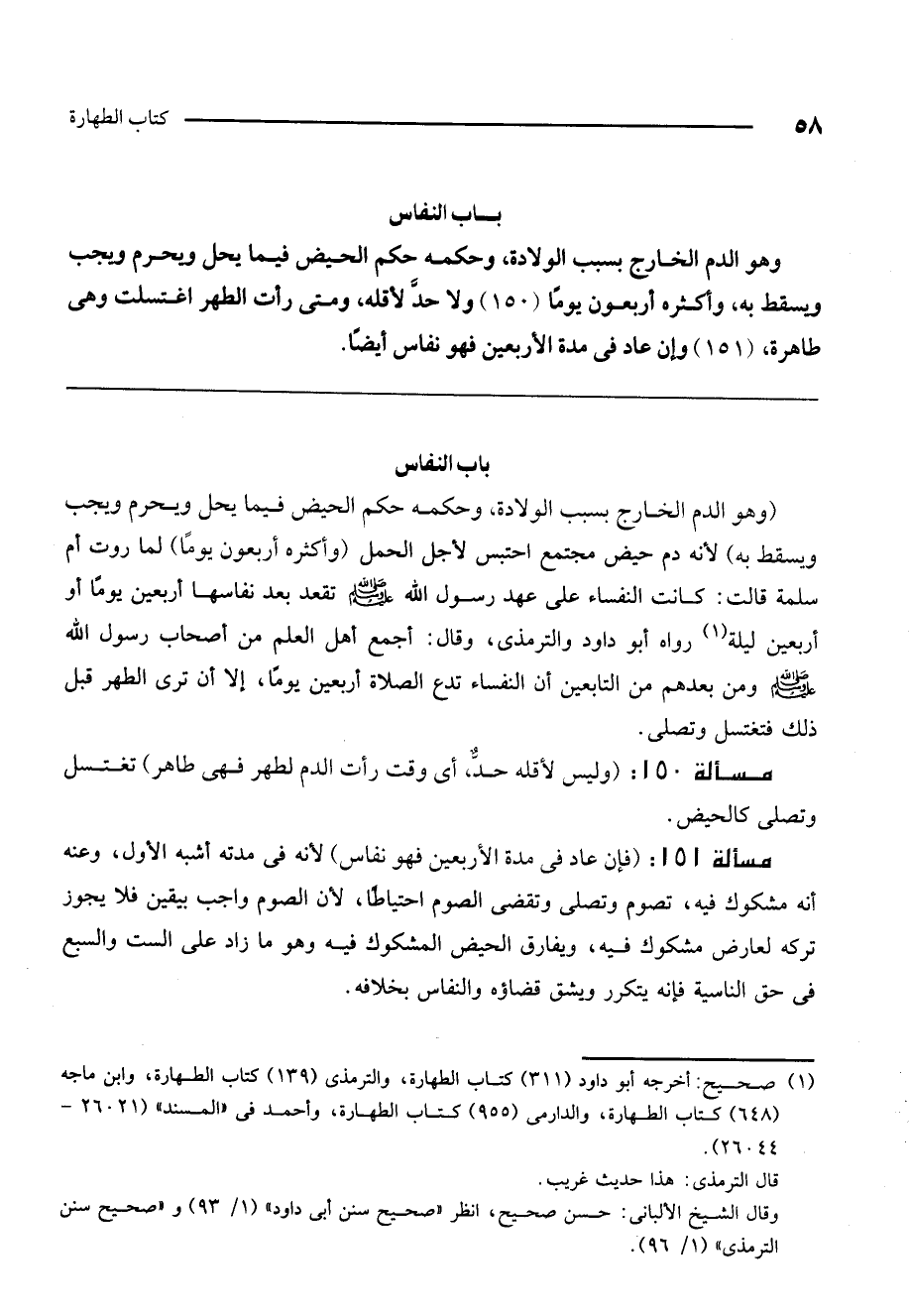 (وهو الدم الخارج بسبب الولادة، وحكمه حكم الحيض فيما يحل ويحرم ويجب ويسقط به) لأنه دم حيض مجتمع احتبس لأجل الحمل (وأكثره أربعون يوماً) لما روت أم سلمة «قالت: كانت النفساء على عهد رسول الله - صَلَّى اللَّهُ عَلَيْهِ وَسَلَّمَ - تقعد بعد نفاسها أربعين يوماً أو أربعين ليلة» رواه أبو داود، والترمذي، وقال: أجمع أهل العلم من أصحاب رسول الله - صَلَّى اللَّهُ عَلَيْهِ وَسَلَّمَ - ومن بعدهم من التابعين أن النفساء تدع الصلاة أربعين يوماً، إلا أن ترى الطهر قبل ذلك فتغتسل وتصلي.