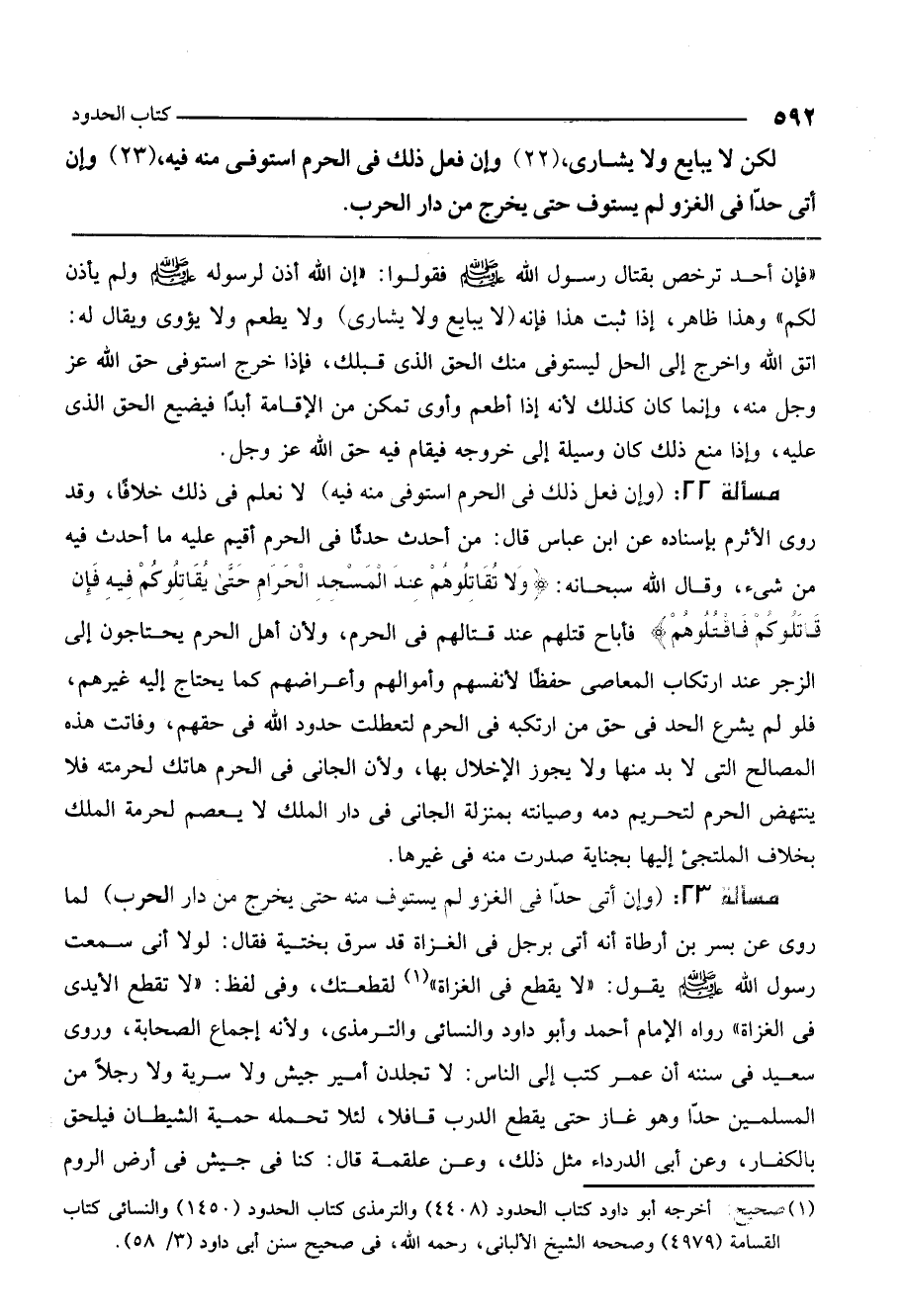 مسألة 23: (وإن أتى حدا في الغزو لم يستوف منه حتى يخرج من دار الحرب) لما روي عن بسر بن أرطاة أنه أتي برجل في الغزاة قد سرق بختية فقال: لولا أني سمعت رسول الله - صَلَّى اللَّهُ عَلَيْهِ وَسَلَّمَ - يقول: «لا يقطع في الغزاة» لقطعتك، وفي لفظ «لا تقطع الأيدي في الغزاة» رواه الإمام أحمد وأبو داود والنسائي والترمذي، ولأنه إجماع الصحابة، وروى سعيد في سننه أن عمر كتب إلى الناس: لا تجلدن أمير جيش ولا سرية ولا رجلا من المسلمين حدا وهو غاز حتى يقطع الدرب قافلا، لئلا تحمله حمية الشيطان فيلحق بالكفار، وعن أبي الدرداء مثل ذلك، وعن علقمة قال: كنا في جيش في أرض الروم