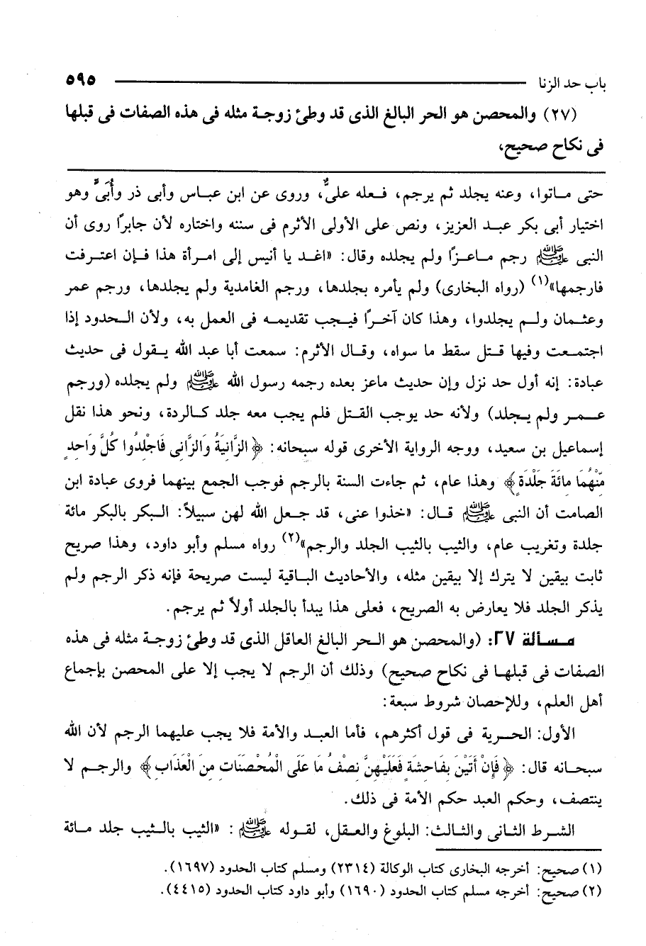 (27) والمحصن هو الحر البالغ الذي قد وطئ زوجة مثله في هذه الصفات في قبلها في نكاح صحيح