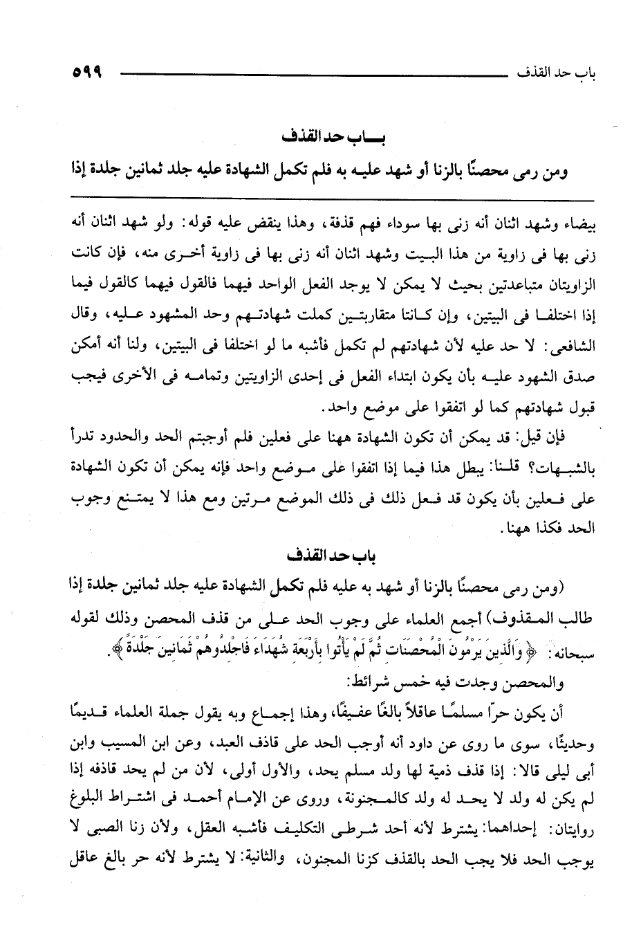 (ومن رمى محصنا بالزنا أو شهد به عليه فلم تكمل الشهادة عليه جلد ثمانين جلدة إذا طالب المقذوف) أجمع العلماء على وجوب الحد على من قذف المحصن، وذلك لقوله سبحانه: {وَالَّذِينَ يَرْمُونَ الْمُحْصَنَاتِ ثُمَّ لَمْ يَأْتُوا بِأَرْبَعَةِ شُهَدَاءَ فَاجْلِدُوهُمْ ثَمَانِينَ جَلْدَةً} [النور: 4] .