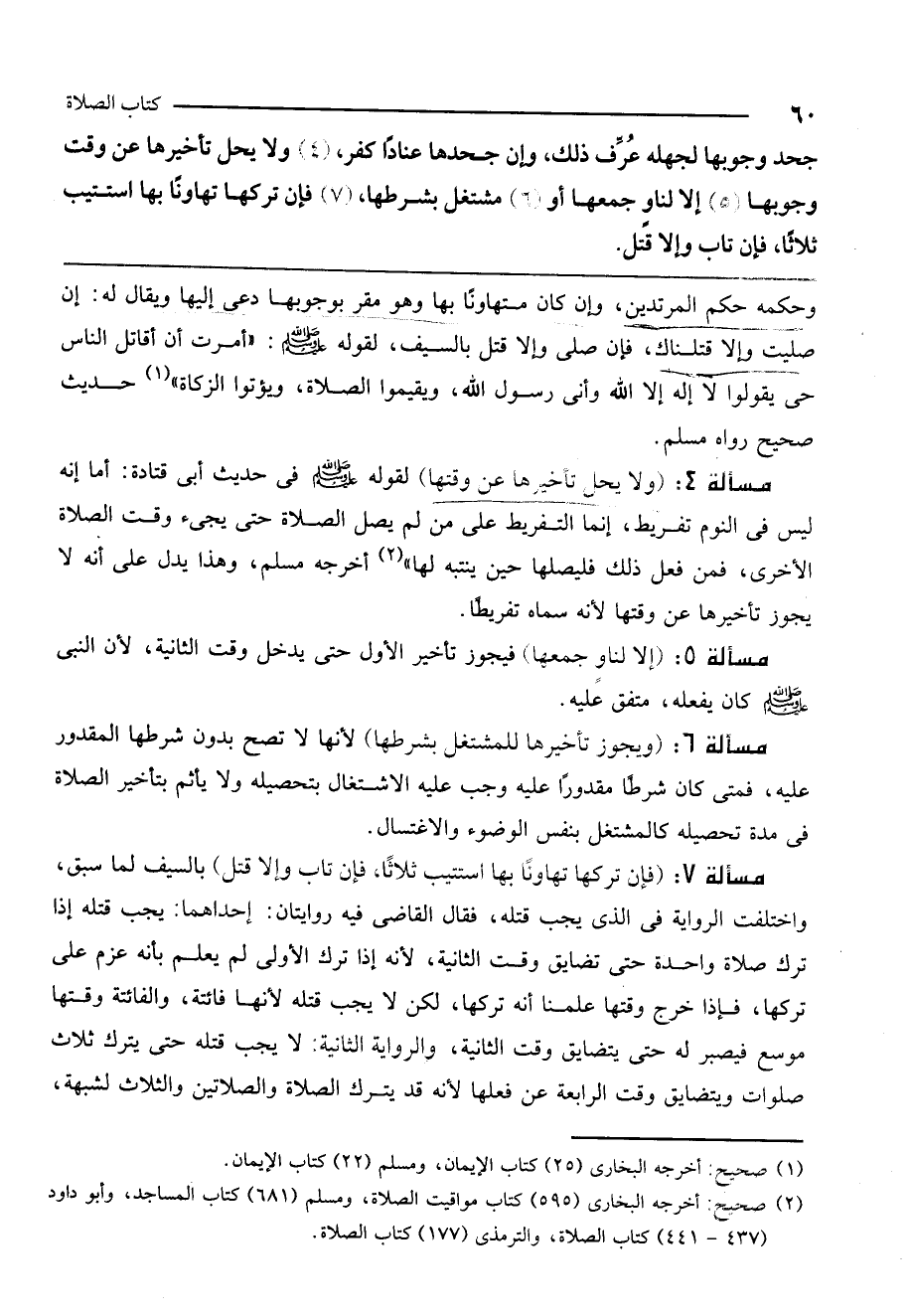 مسألة 4: (ولا يحل تأخيرها عن وقتها) لقوله - صَلَّى اللَّهُ عَلَيْهِ وَسَلَّمَ - في حديث أبي قتادة: «أما إنه ليس في النوم تفريط، إنما التفريط على من لم يصل الصلاة حتى يجيء وقت الصلاة الأخرى، فمن فعل ذلك فليصلها حين ينتبه لها» أخرجه مسلم، وهذا يدل على أنه لا يجوز تأخيرها عن وقتها لأنه سماه تفريطاً.