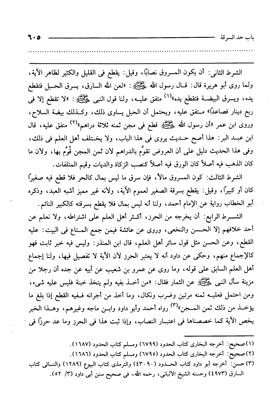 ـــــــــــــــــــــــــــــQالشرط الثاني: أن يكون المسروق نصابا، وقيل يقطع في القليل والكثير؛ لظاهر الآية، ولما روى أبو هريرة قال: قال رسول الله - صَلَّى اللَّهُ عَلَيْهِ وَسَلَّمَ -: «لعن الله السارق، يسرق الحبل فتقطع يده، ويسرق البيضة فتقطع يده» متفق عليه، ولنا قول النبي - صَلَّى اللَّهُ عَلَيْهِ وَسَلَّمَ -: " «لا تقطع إلا في ربع دينار فصاعدا» متفق عليه، ويحتمل أن الحبل يساوي ذلك، وكذلك بيضة السلاح، وروى ابن عمر «أن رسول الله - صَلَّى اللَّهُ عَلَيْهِ وَسَلَّمَ - قطع في مجن ثمنه ثلاثة دراهم» متفق عليه، قال ابن عبد البر: هذا أصح حديث يروى في هذا الباب، ولا يختلف أهل العلم في ذلك، وفي هذا الحديث دليل على أن العروض تقوم بالدراهم؛ لأن ثمن المجن قوم بها، ولأن ما كان الذهب فيه أصلا كان الورق فيه أصلا كنصب الزكاة والديات وقيم المتلفات.