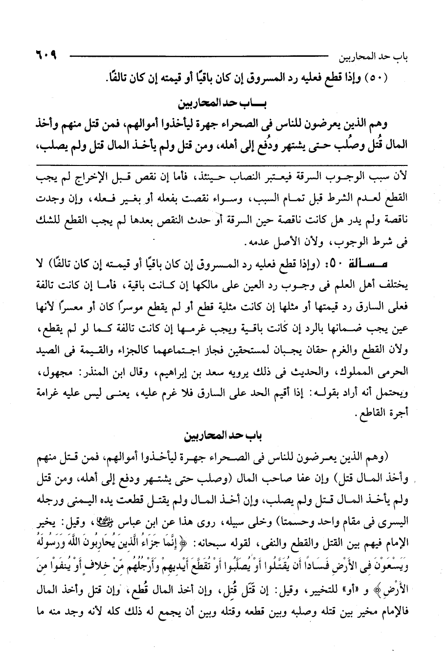 باب حد المحاربين وهم الذين يعرضون للناس في الصحراء جهرة ليأخذوا أموالهم، فمن قتل منهم وأخذ المال قتل وصلب حتى يشتهر ودفع إلى أهله، ومن قتل ولم يأخذ المال قتل ولم يصلب