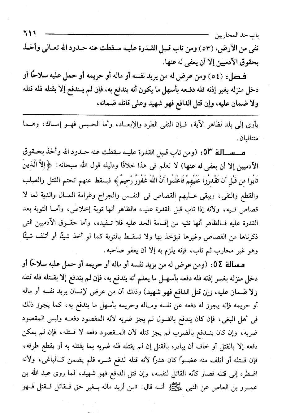مسألة 54: (ومن عرض له من يريد نفسه أو ماله أو حريمه أو حمل عليه سلاحا أو دخل منزله بغير إذنه فله دفعه بأسهل ما يعلم أنه يندفع به، فإن لم يندفع إلا بقتله فله قتله ولا ضمان عليه، وإن قتل الدافع فهو شهيد) ، وذلك أن من عرض لإنسان يريد نفسه أو ماله أو حريمه فإنه يجوز له دفعه عن نفسه وماله وحريمه بأسهل ما يندفع به، كما يجوز ذلك في أهل البغي، فإن كان يندفع بالقول لم يجز ضربه؛ لأن المقصود دفعه وليس المقصود ضربه، وإن كان يندفع بالضرب لم يجز قتله لأن المقصود دفعه لا قتله، فإن لم يمكن دفعه إلا بالقتل أو خاف أن يبادره بالقتل إن لم يقتله فله ضربه بما يقتله به أو يقطع طرفه، فإن قتله أو أتلف منه عضوا كان هدرا لأنه قتله لدفع شره فلم يضمن كالباغي، ولأنه اضطره إلى قتله فصار كأنه القاتل لنفسه، وإن قتل الدافع فهو شهيد، لما روى عبد الله بن عمرو بن العاص عن النبي - صَلَّى اللَّهُ عَلَيْهِ وَسَلَّمَ - أنه قال: «من أريد ماله بغير حق فقاتل فقتل فهو
