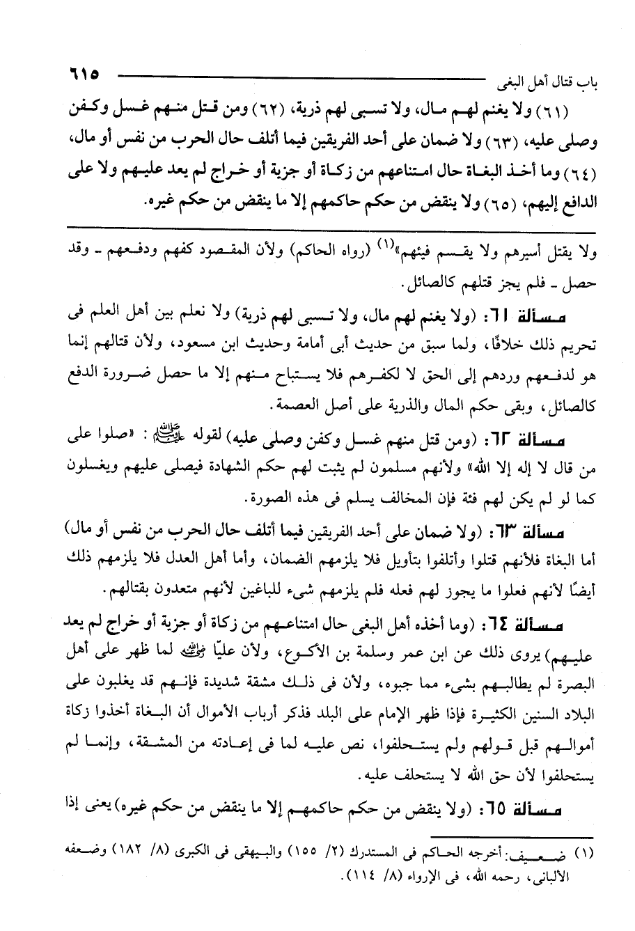 مسألة 61: (ولا يغنم لهم مال، ولا تسبى لهم ذرية) ، ولا نعلم بين أهل العلم في تحريم ذلك خلافا، ولما سبق من حديث أبي أمامة وحديث ابن مسعود، ولأن قتالهم إنما هو لدفعهم وردهم إلى الحق لا لكفرهم فلا يستباح منهم إلا ما حصل ضرورة الدفع كالصائل، وبقي حكم المال والذرية على أصل العصمة.