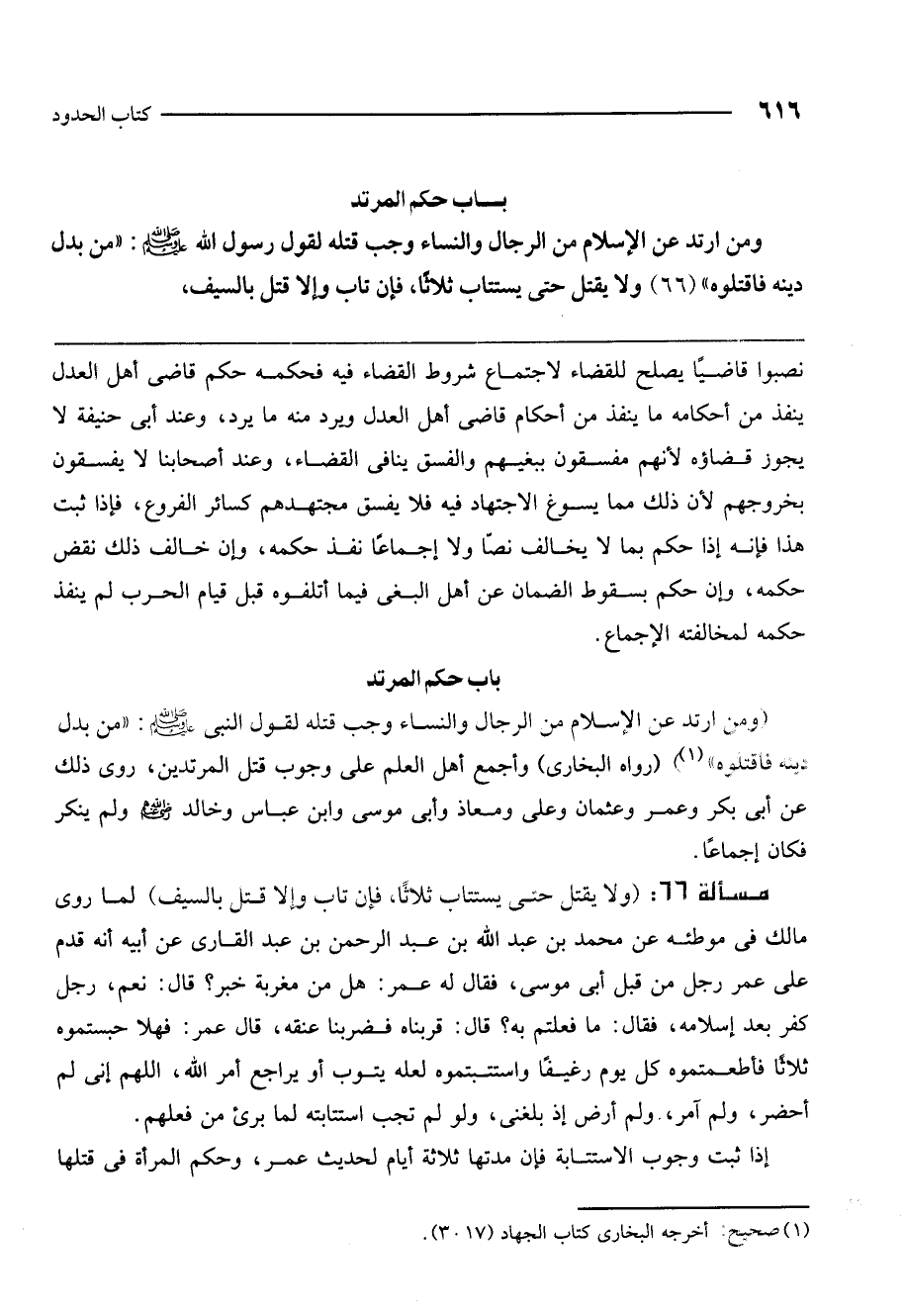 باب حكم المرتد ومن ارتد عن الإسلام من الرجال والنساء وجب قتله؛ لقول رسول الله - صَلَّى اللَّهُ عَلَيْهِ وَسَلَّمَ -: «من بدل دينه فاقتلوه»