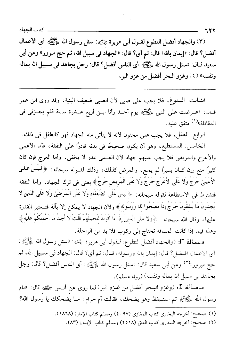 مسألة 3: (والجهاد أفضل التطوع، لقول أبي هريرة - رَضِيَ اللَّهُ عَنْهُ -: «سئل رسول الله - صَلَّى اللَّهُ عَلَيْهِ وَسَلَّمَ -: أي الأعمال أفضل؟ قال: إيمان بالله ورسوله، قال: ثم أي؟ قال: الجهاد في سبيل الله، ثم حج مبرور "، وعن أبي سعيد قال: " سئل رسول الله - صَلَّى اللَّهُ عَلَيْهِ وَسَلَّمَ -: أي الناس أفضل؟ قال: رجل يجاهد في سبيل الله بماله ونفسه) » (رواه مسلم) .