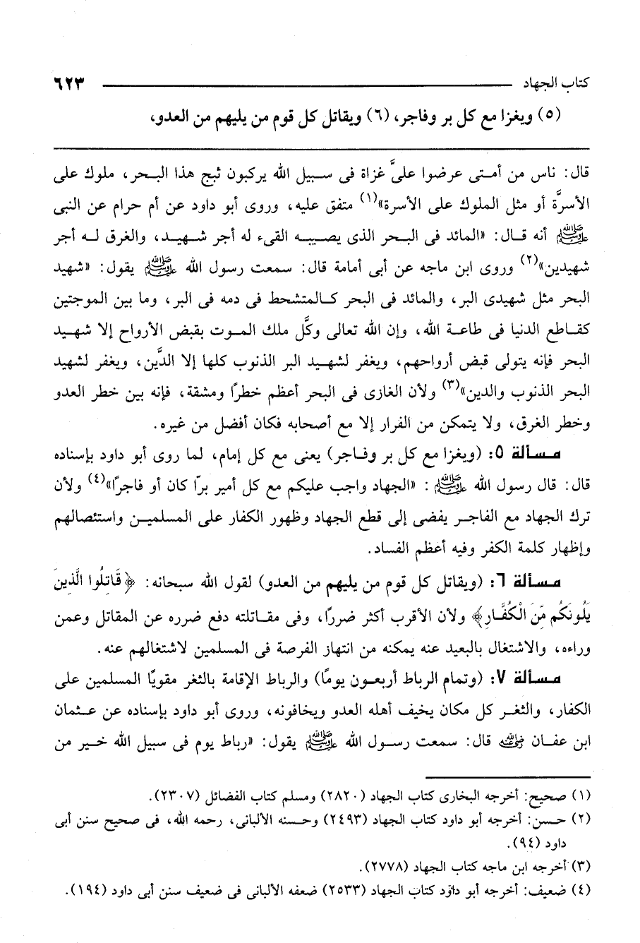 ـــــــــــــــــــــــــــــQقال: ناس من أمتي عرضوا علي غزاة في سبيل الله يركبون ثبج هذا البحر، ملوك على الأسرة أو مثل الملوك على الأسرة» متفق عليه، وروى أبو داود عن أم حرام عن النبي - صَلَّى اللَّهُ عَلَيْهِ وَسَلَّمَ - أنه قال: «المائد في البحر الذي يصيبه القيء له أجر شهيد، والغرق له أجر شهيدين» ، وروى ابن ماجه عن أبي أمامة قال: سمعت رسول الله - صَلَّى اللَّهُ عَلَيْهِ وَسَلَّمَ - يقول: «شهيد البحر مثل شهيدي البر، والمائد في البحر كالمتشحط في دمه في البر، وما بين الموجتين كقاطع الدنيا في طاعة الله، وإن الله تعالى وكل ملك الموت بقبض الأرواح إلا شهيد البحر فإنه يتولى قبض أرواحهم، ويغفر لشهيد البر الذنوب كلها إلا الدين، ويغفر لشهيد البحر الذنوب والدين» ، ولأن الغازي في البحر أعظم خطرا ومشقة، فإنه بين خطر العدو وخطر الغرق، ولا يتمكن من الفرار إلا مع أصحابه فكان أفضل من غيره.