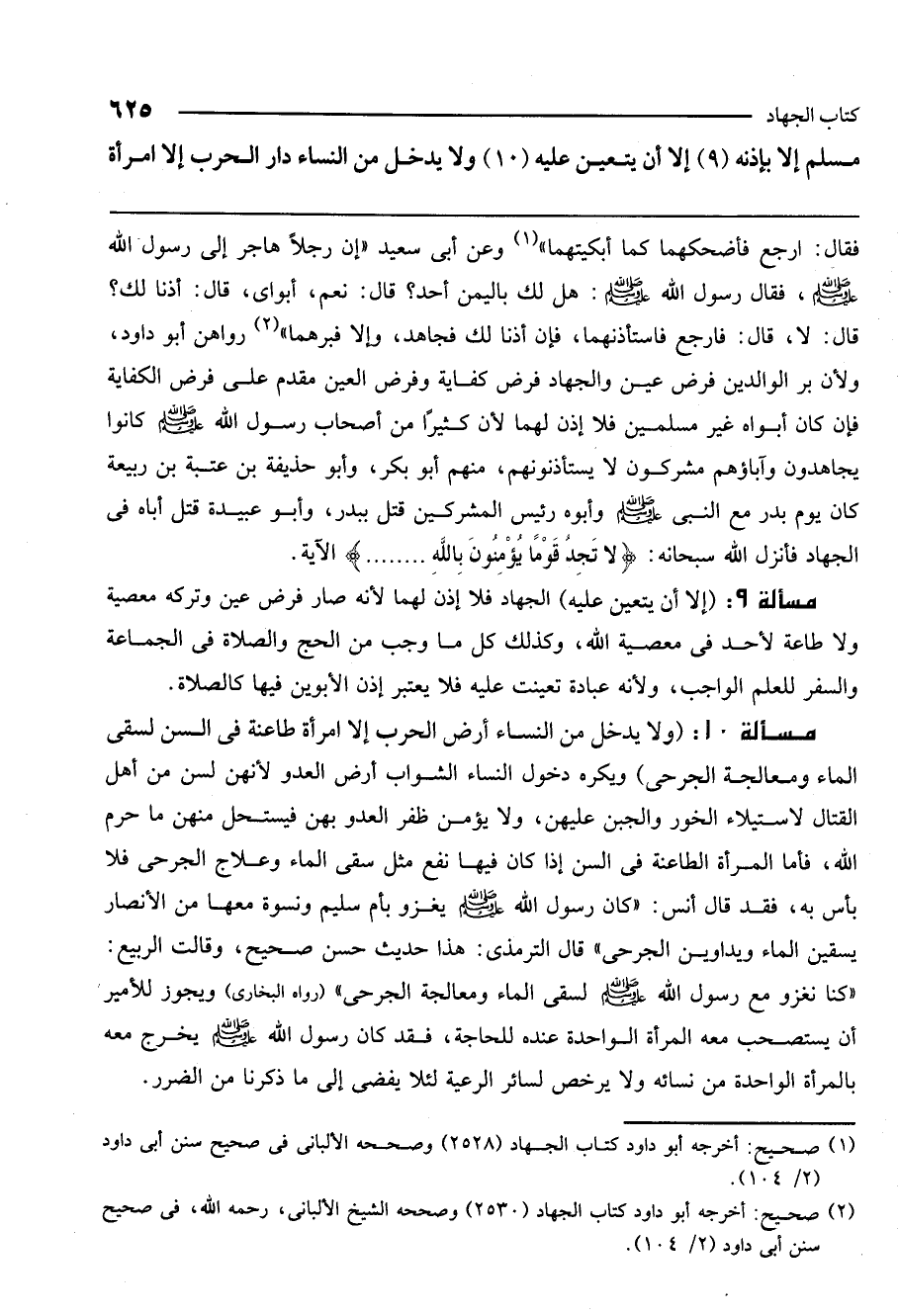 مسألة 10: (ولا يدخل من النساء أرض الحرب إلا امرأة طاعنة في السن لسقي الماء ومعالجة الجرحى) ويكره دخول النساء الشواب أرض العدو؛ لأنهن لسن من أهل القتال لاستيلاء الخور والجبن عليهن، ولا يؤمن ظفر العدو بهن فيستحل منهن ما حرم الله، فأما المرأة الطاعنة في السن إذا كان فيها نفع مثل سقي الماء وعلاج الجرحى فلا بأس به، فقد قال أنس: «كان رسول الله - صَلَّى اللَّهُ عَلَيْهِ وَسَلَّمَ - يغزو بأم سليم ونسوة معها من الأنصار يسقين الماء ويداوين الجرحى» ، قال الترمذي: هذا حديث حسن صحيح، وقالت الربيع: " «كنا نغزو مع رسول الله - صَلَّى اللَّهُ عَلَيْهِ وَسَلَّمَ - لسقي الماء ومعالجة الجرحى» (رواه البخاري) ، ويجوز للأمير أن يستصحب معه المرأة الواحدة عنده للحاجة، فقد كان رسول الله - صَلَّى اللَّهُ عَلَيْهِ وَسَلَّمَ - يخرج معه بالمرأة الواحدة من نسائه ولا يرخص لسائر الرعية لئلا يفضي إلى ما ذكرنا من الضرر.